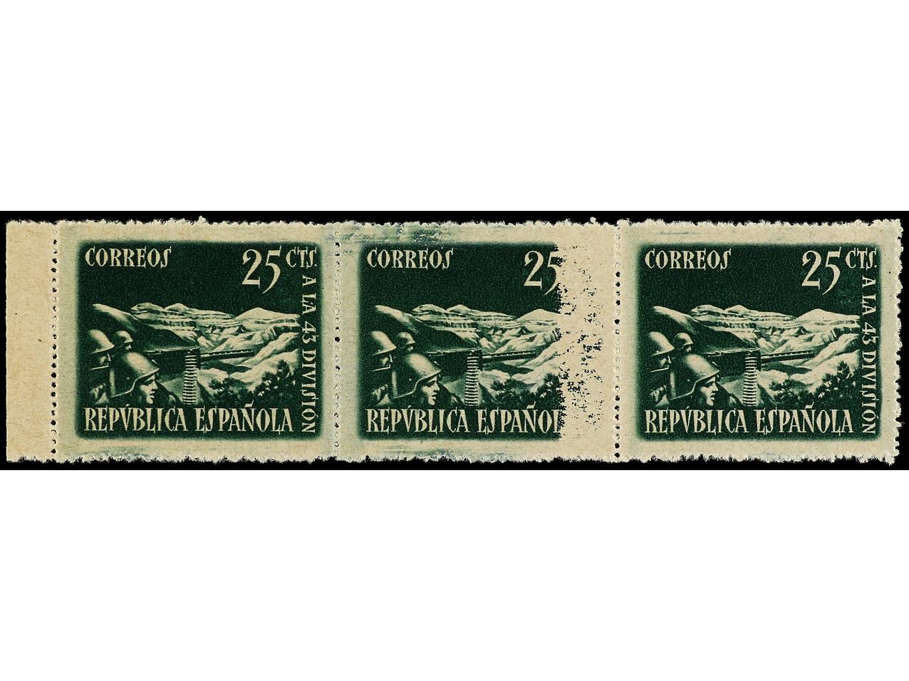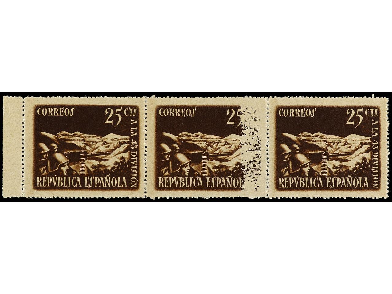 ESPAÑA. 25 cts. castaño, dentado 16. CAMBIO DE COLOR. Tira de tres, sello central importante defecto de impresión. Ed.787cc. (Image1)