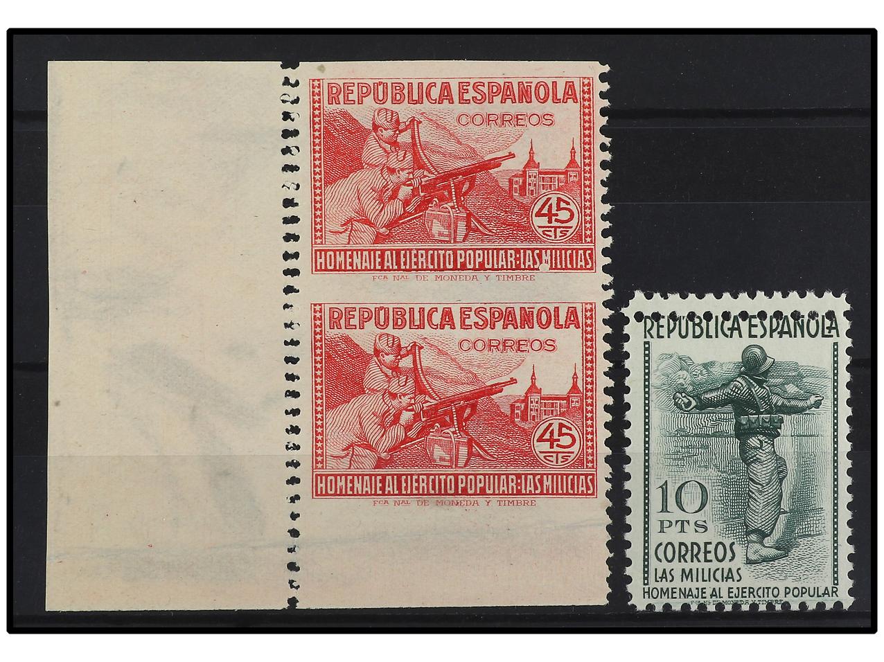 ESPAÑA. 45 cts. carmín. Pareja vertical SIN DENTAR HORIZONTALMENTE y DOBLE DENTADO VERTICAL y 10 pts. verde DOBLE DENTADO HORIZONTAL. Ed.795, 800.