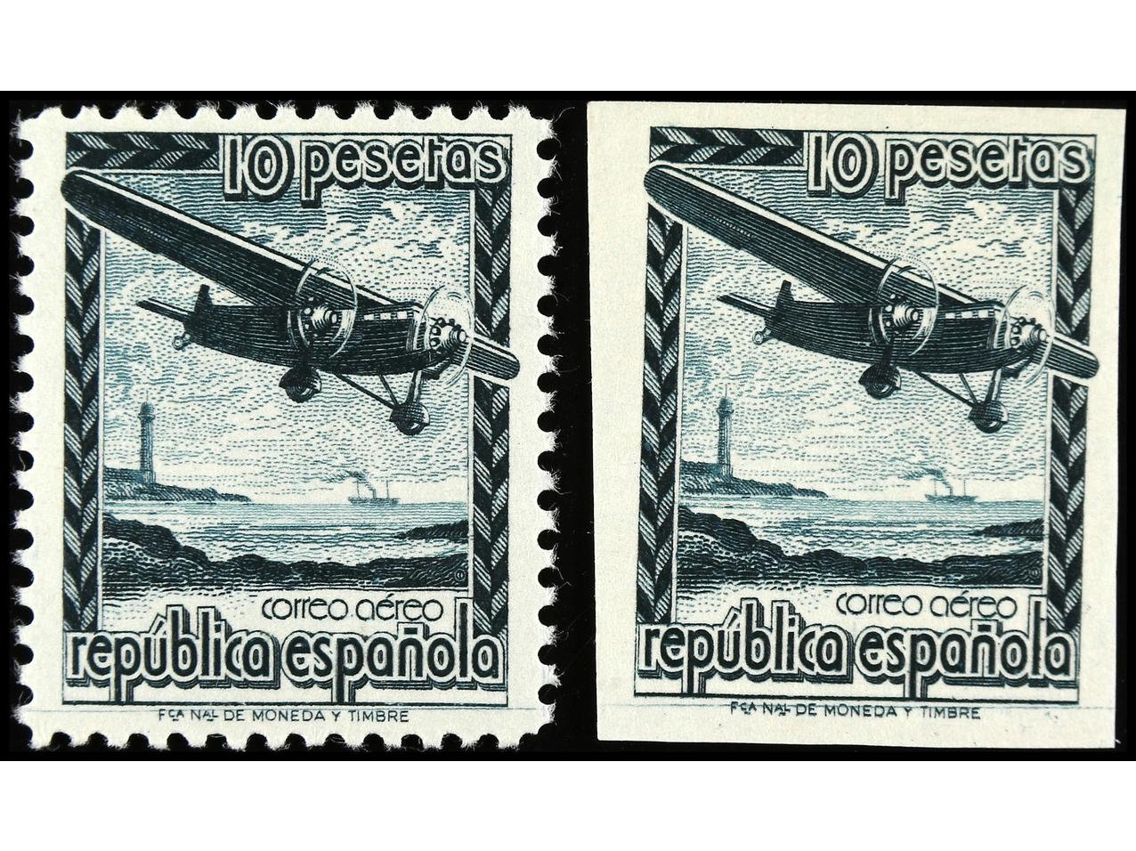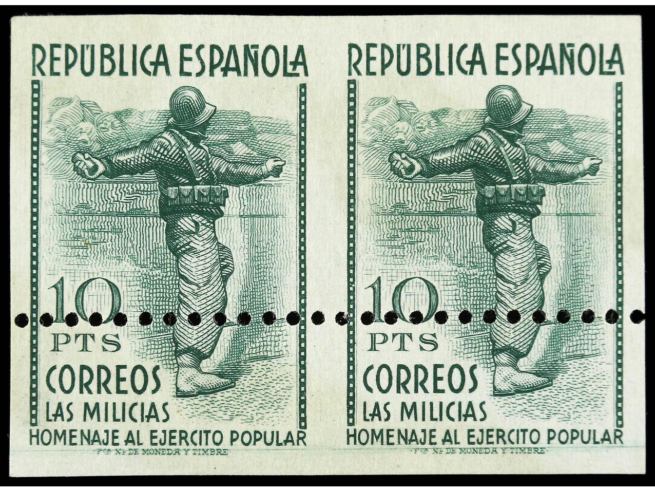 ESPAÑA. 10 pts. verde. Pareja SIN DENTAR con solo una hilera de dentado en medio. Ed.800. (Image1)