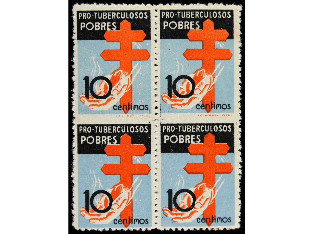 ESPAÑA. 10 cts. negro, azul celeste y rojo. Bloque de cuatro SIN PERFORADO HORIZONTAL EN EL CENTRO. RARO y de LUJO. Ed.840spv (2). Cat. +186€.