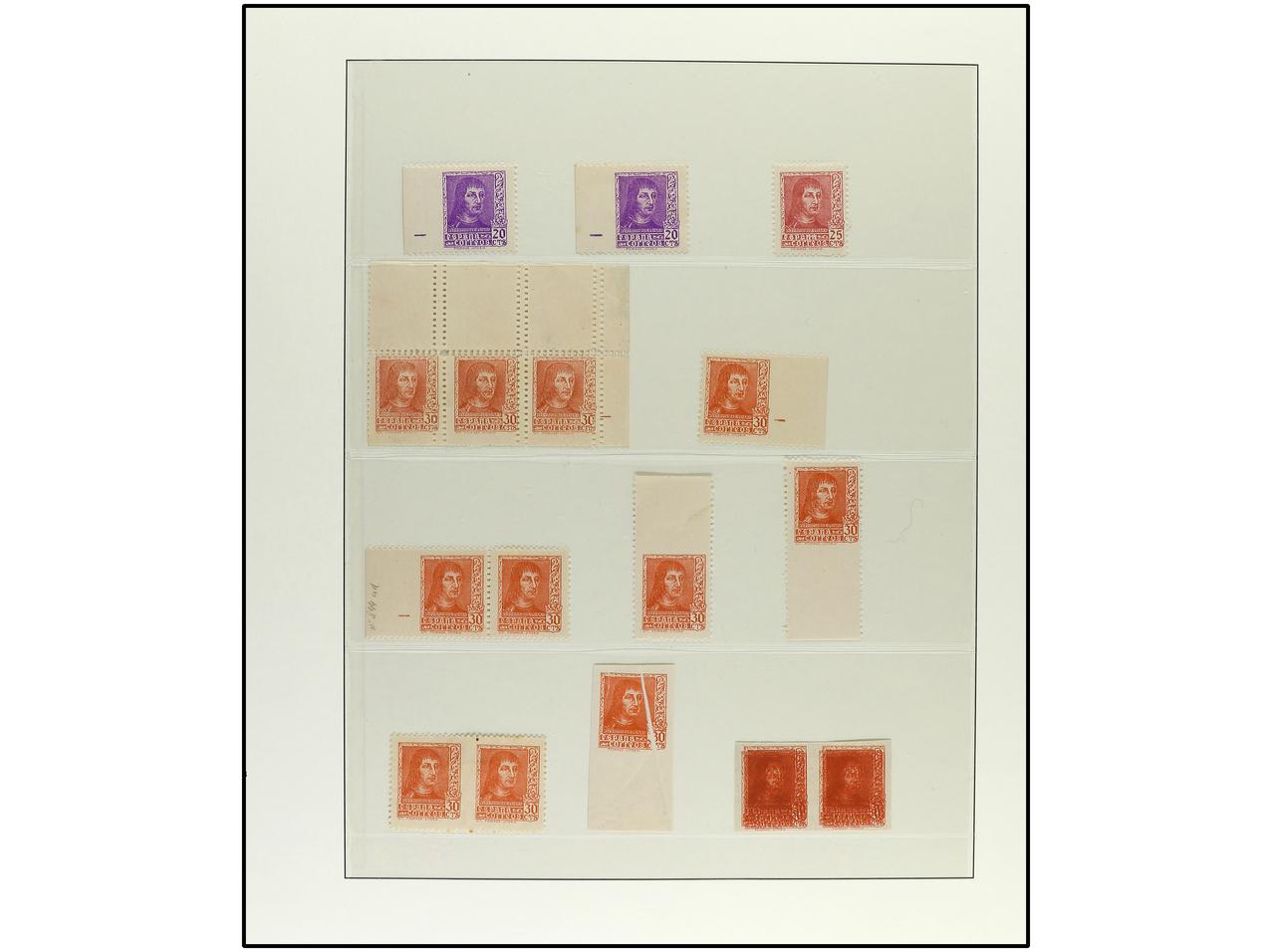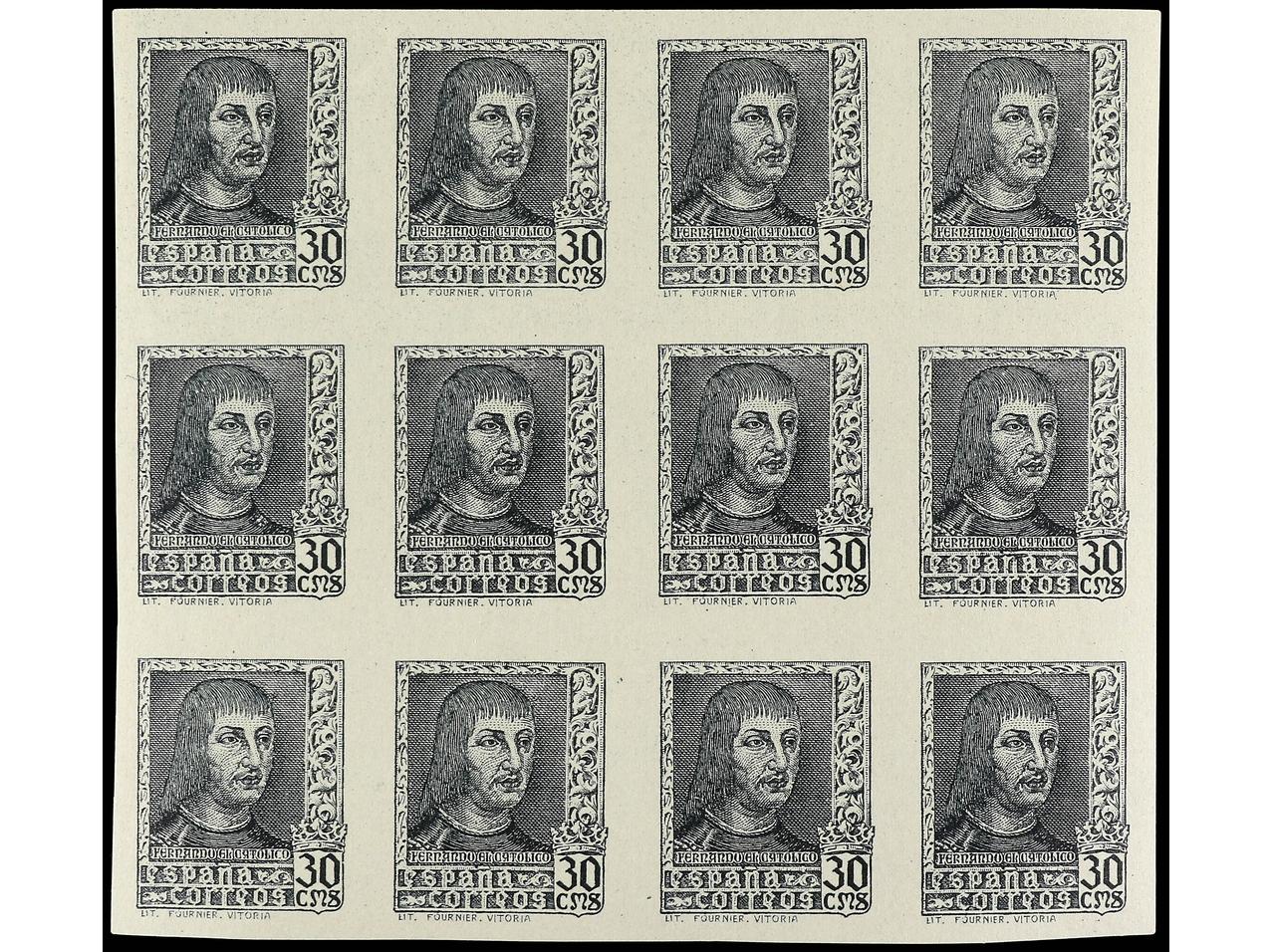 ESPAÑA. 30 céntimos pizarra sin dentar, CAMBIO DE COLOR. Bloque de 12. Ed.844Aecb. Cat. 1.824€. (Image1)