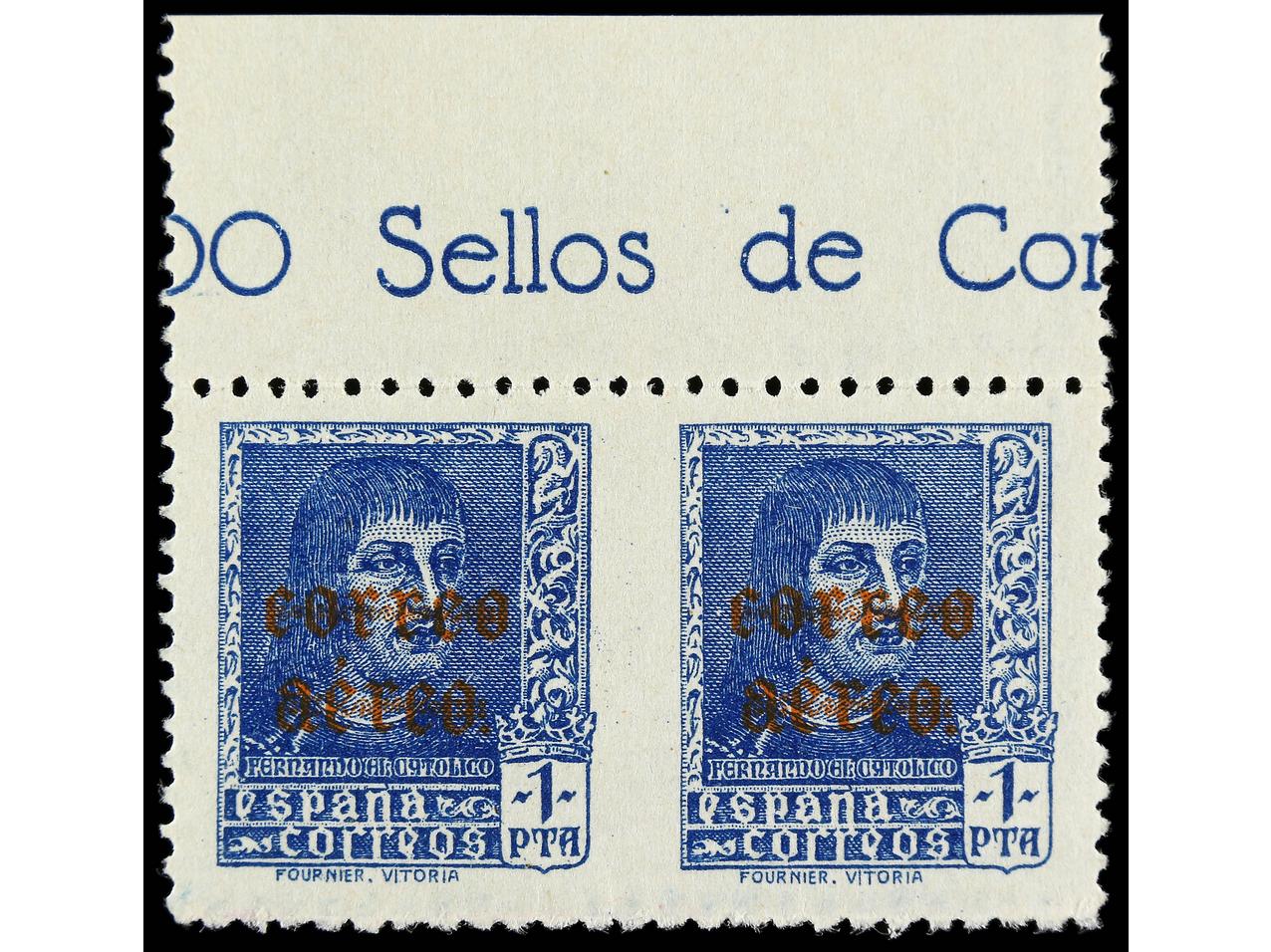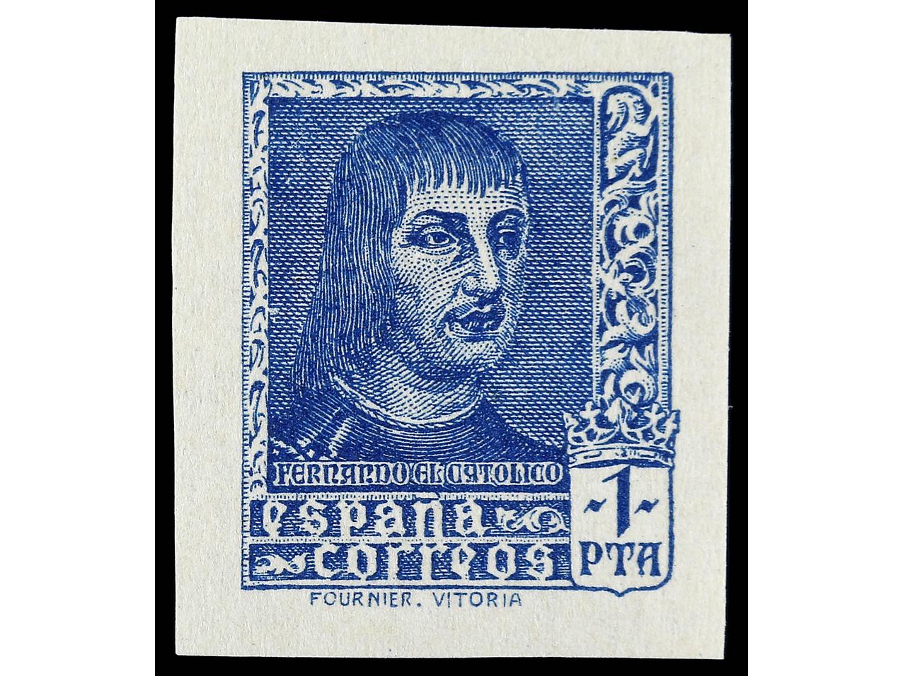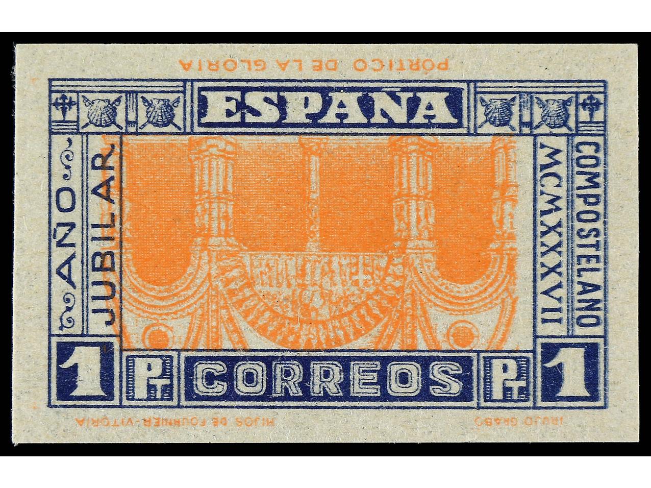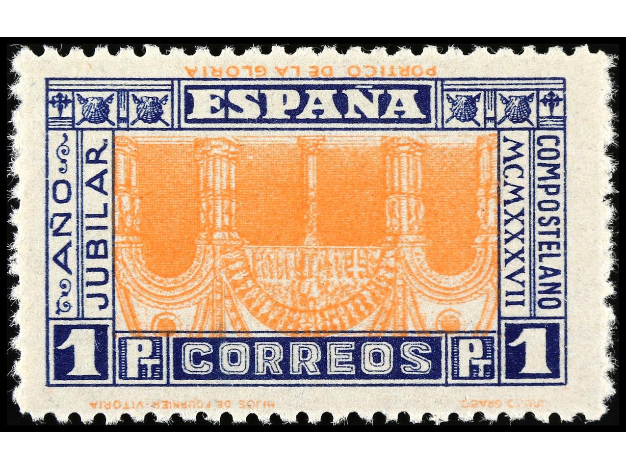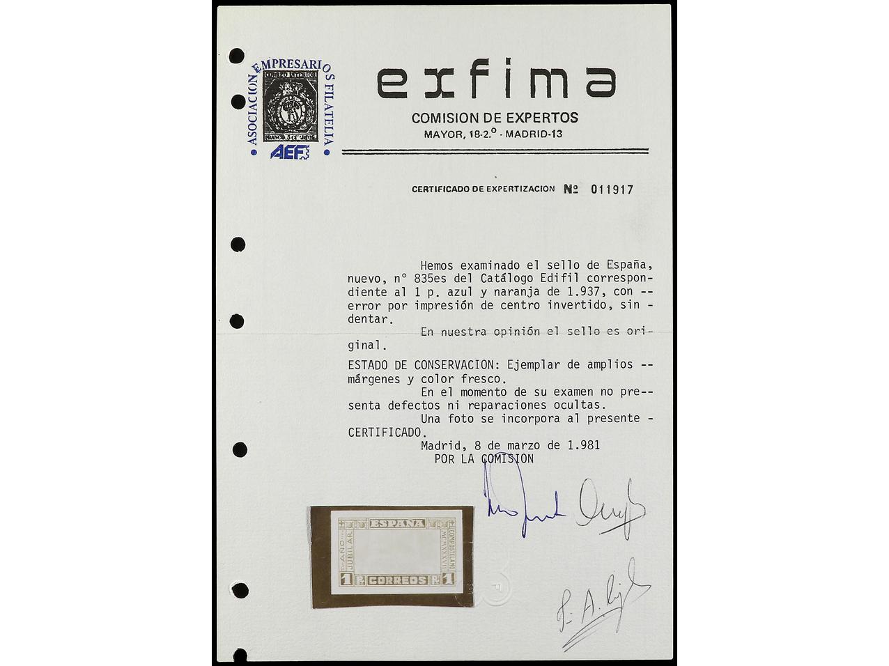 ESPAÑA. 1 pta. azul y naranja CENTRO INVERTIDO SIN DENTAR. RARO y de LUJO. Cert. EXFIMA (1981). Ed.835eis. Cat. 1.300€. (Image1) (Image2)