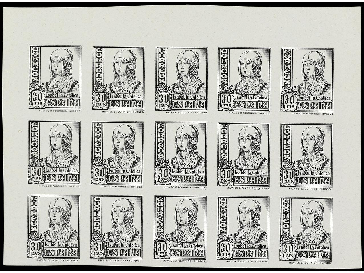 ESPAÑA. 30 cts. negro. ENSAYO DE PLANCHA. Bloque de 15 sellos procedente del bloque reporte de 25. RARO. Ed.823. (Image1)