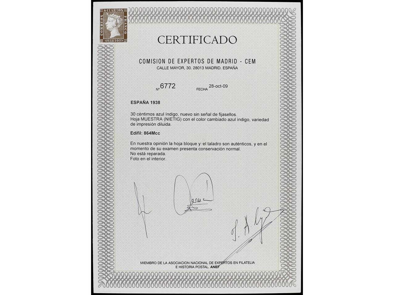 ESPAÑA. HB 30 cts. azul índigo. SIN DENTAR, COLOR CAMBIADO y variedad IMPRESIÓN DILUIDA con perforación ´NIETIG´. RARAS. Cert. CEM. Ed.864Mcc.