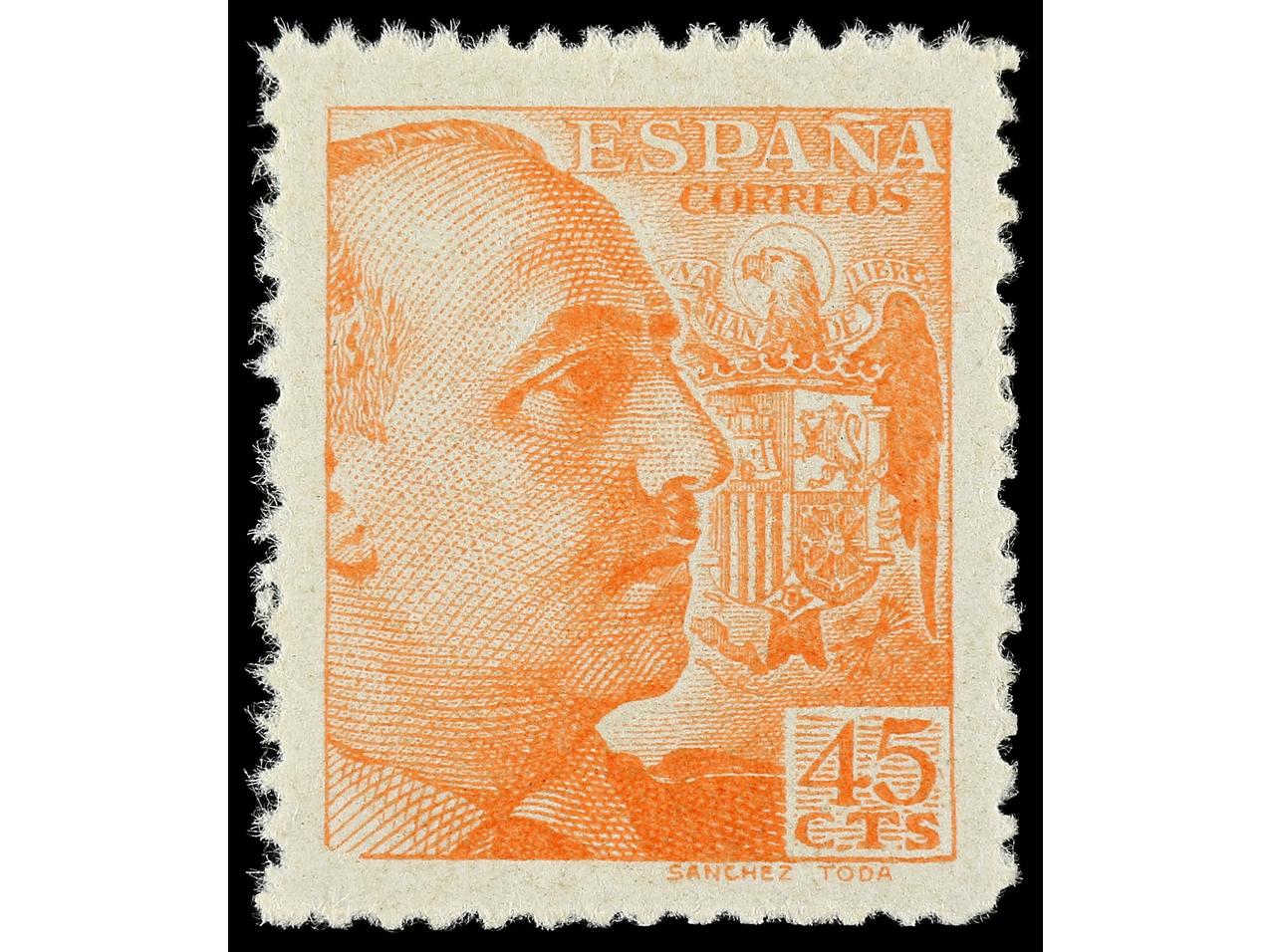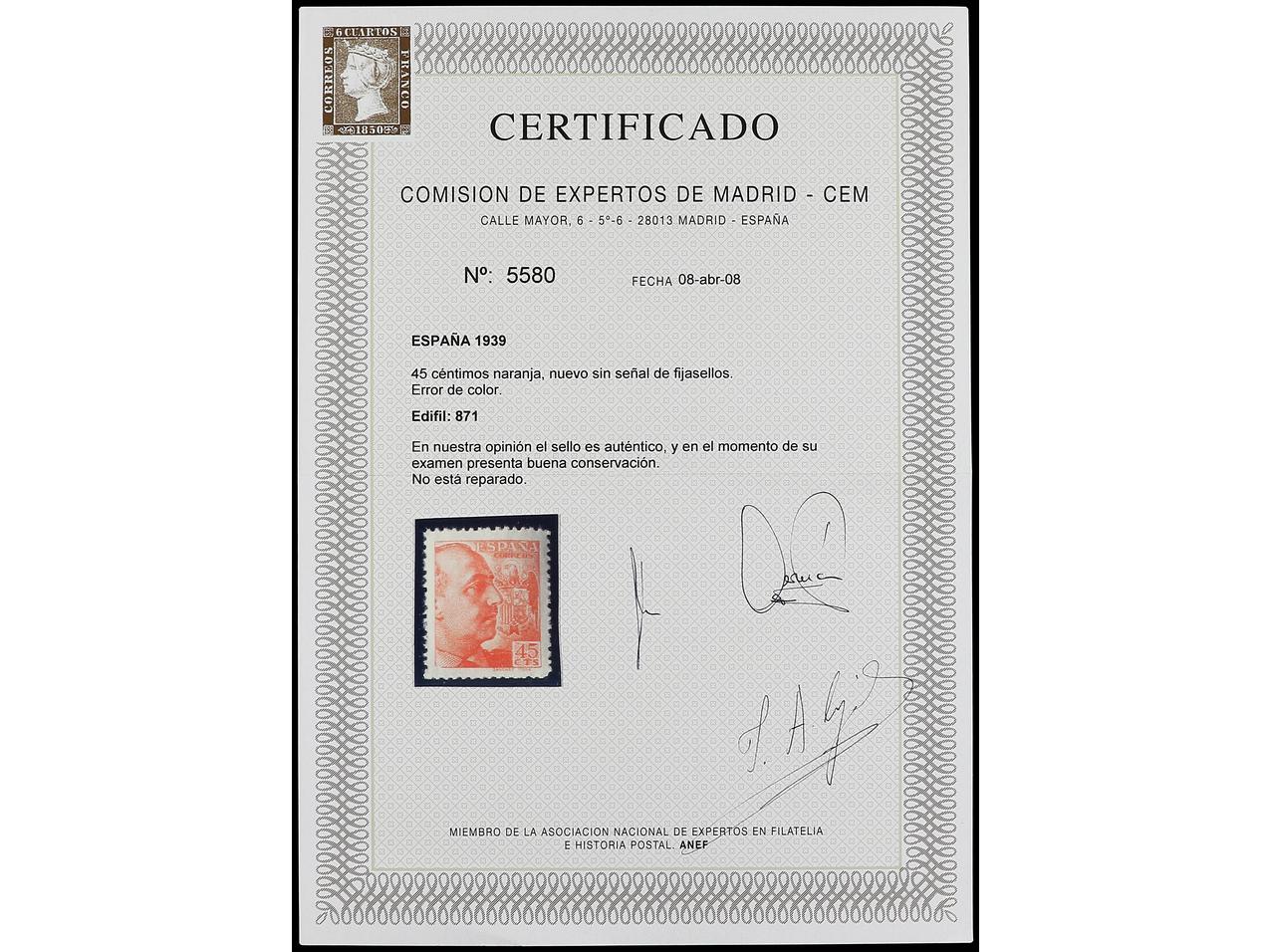 ESPAÑA. 45 cts. naranja ERROR DE COLOR. MAGNÍFICO y no reseñado. RARÍSIMO. Cert. CEM. Ed.871. (Image1) (Image2)