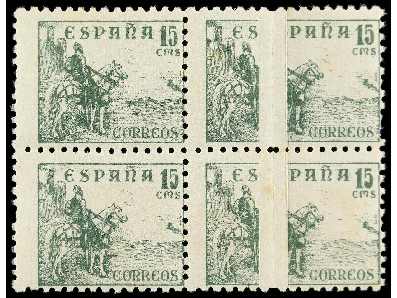 ESPAÑA. 15 cts. verde. Bloque de cuatro FUELLE DEL PAPEL en dos sellos. RARO. Leves sombras del tiempo. Ed.918iw. (Image1)