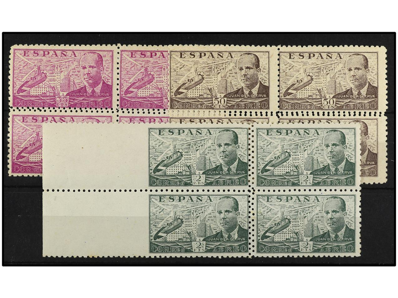 ESPAÑA. 35 y 50 cts. en bloques de cuatro con DOBLE DENTADO HORIZONTAL y 2 pts. en bloque de cuatro con DOBLE DENTADO VERTICAL y SIN DENTAR MARGEN INFERIOR. Ed.942ddh, **943ddh y **945ddvsmf. (Image1) (Image2)