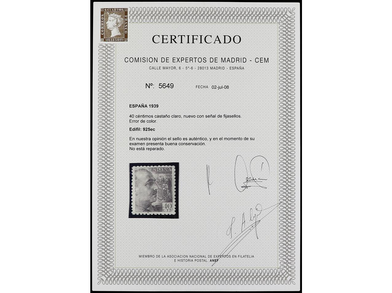 ESPAÑA. 40 cts. castaño claro ERROR de COLOR. RARÍSIMO. Cert. CEM. Ed.925ec. (Image1) (Image2)