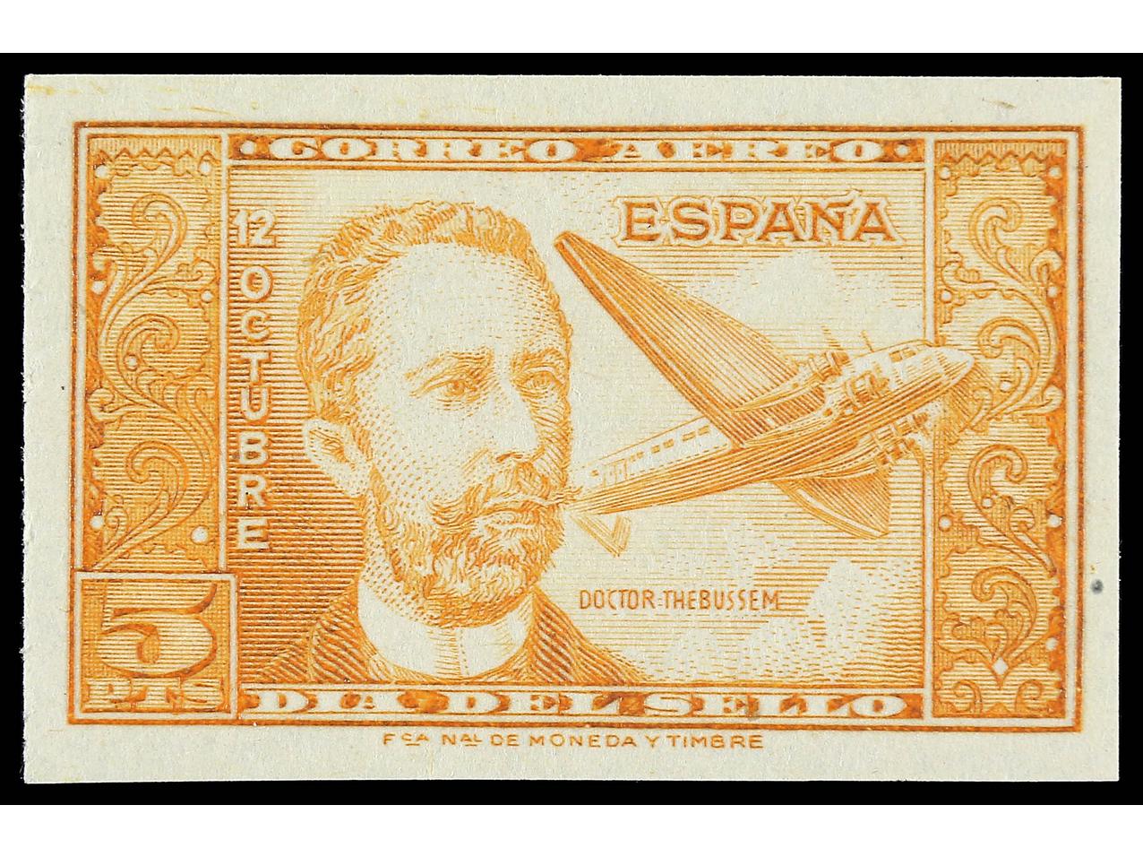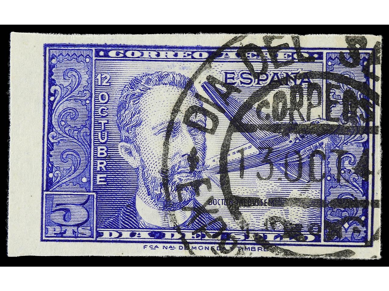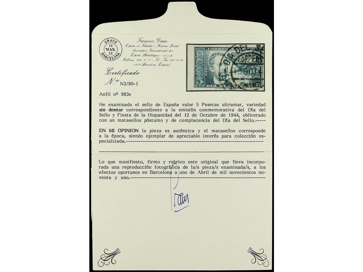 ESPAÑA. 5 pts. azul. SIN DENTAR. Mat. de complacencia del Día del Sello. Márgenes justos teniendo serias dudas de que sea sin dentar. Se vende tal cual, sin derecho a devolución. Cert. GRAUS. Ed.983s. (Image1) (Image2)