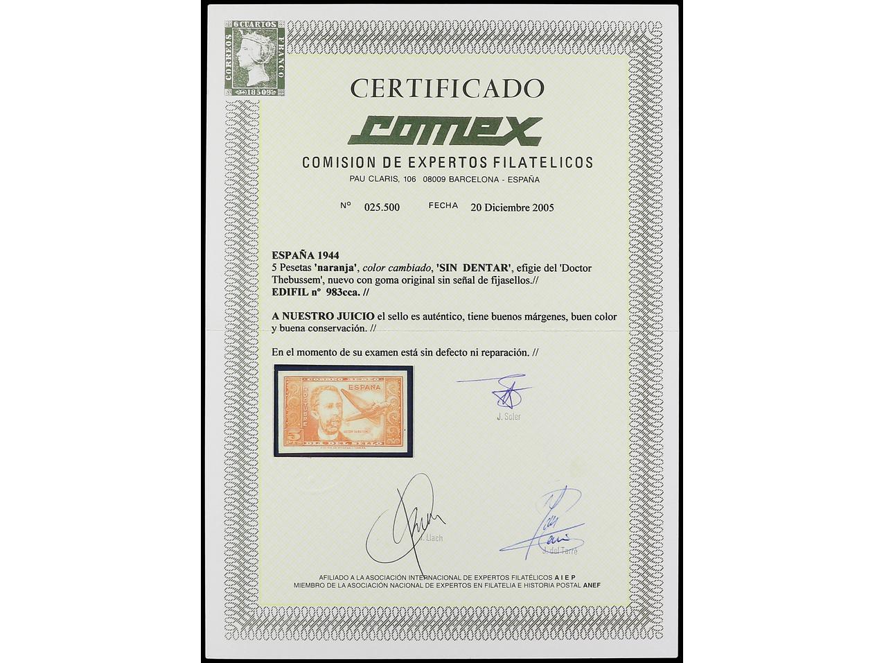 ESPAÑA. 5 pts. naranja. COLOR CAMBIADO SIN DENTAR. RARO. Cert. COMEX. Ed.983ccas. Cat. 600€. (Image1) (Image2)