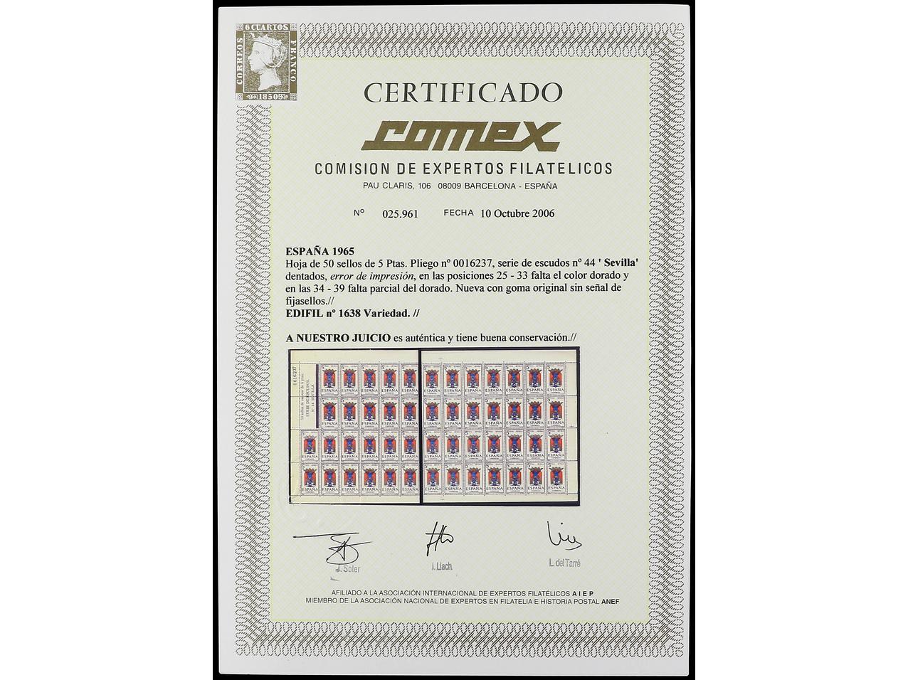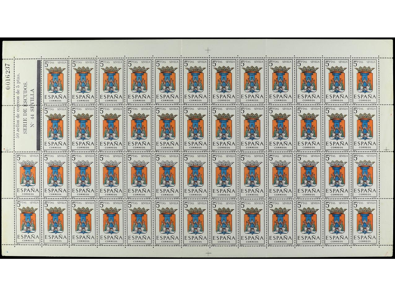 ESPAÑA. ESCUDO DE SEVILLA. 5 pts. multicolor. Hoja de 50 sellos. FALTA EL COLOR ORO en las posiciones 25-33 y en la 34-39 falta parcial del color oro. MUY RARA, no reseñada. Cert. COMEX. Ed.1638. (Image1) (Image2)