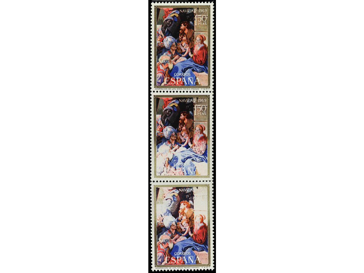 ESPAÑA. NAVIDAD´69. 1,50 pts. multicolor. Tira de tres, sellos inferiores COLORES DILUIDOS, el tercer sello SIN EL VALOR FACIAL. ESPECTACULAR y RARA. Ed.1944.