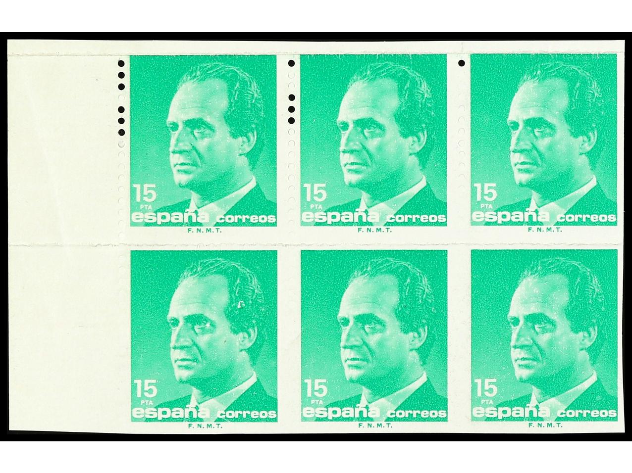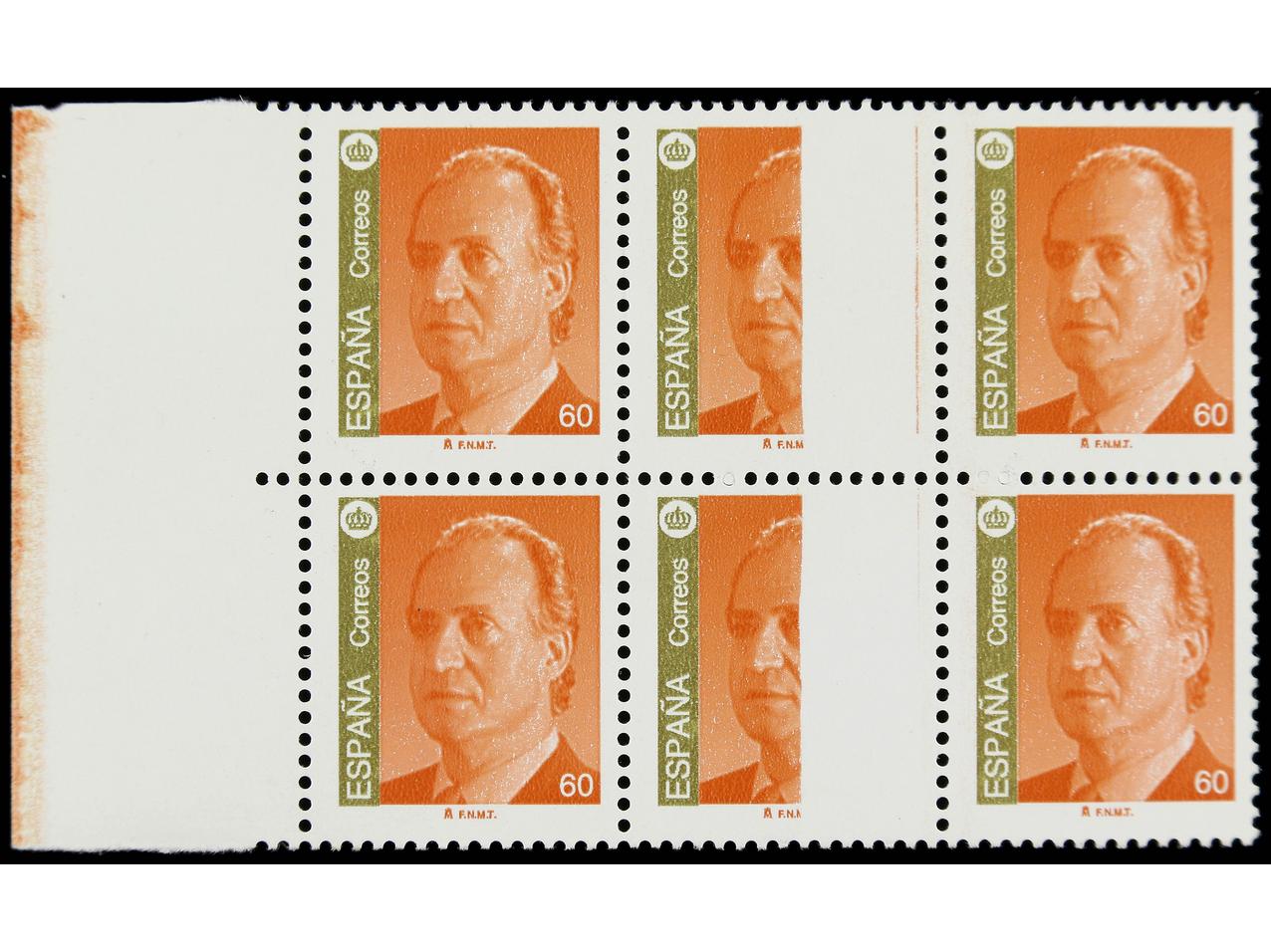ESPAÑA. JUAN CARLOS I. 60 pts. castaño naranja y oro. Bloque de seis, banda sin imprimir en el centro. RARO. Ed.3381. (Image1)