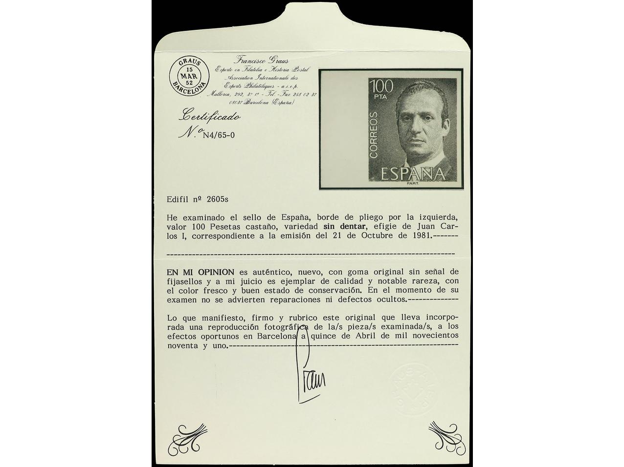 ESPAÑA. JUAN CARLOS I. 100 pts. castaño SIN DENTAR, borde de hoja. LUJO. Cert. GRAUS. Ed.2605s. (Image1) (Image2)