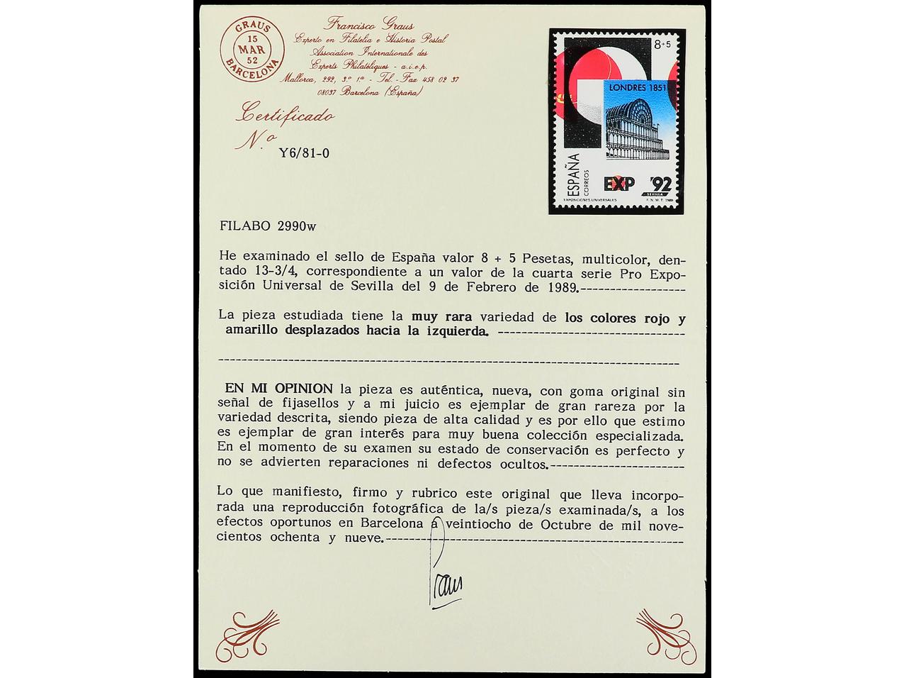 ESPAÑA. EXPO´92. 8 + 5 pts. página de álbum dentados y colores desplazados. Cuatro cert. GRAUS. Ed.2990. (Image1) (Image2)