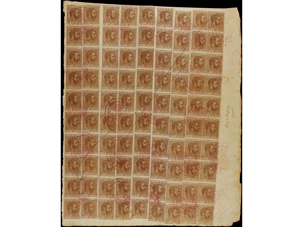 CUBA. 1885. 10 cent. castaño FALSO POSTAL, conjunto de 90 sellos (40 dentados y 50 sin dentar sobre documento de Intervención Judicial de incautación de los sellos falsos con marca ovalada del Juzgado de la Habana. ESPECTACULAR y RARO.