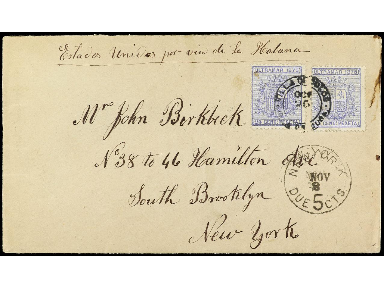 CUBA. 1875. COLON a NEW YORK. 25 cts. azul (2) mat. VILLA DE COLON/ISLA DE CUBA. Ed.32 (2). (Image1) (Image2)