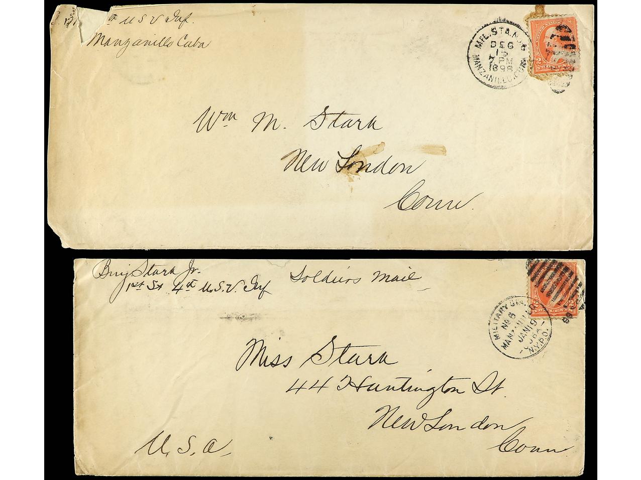 CUBA: OCUPACION ESTADOS UNIDOS. 1898-99. Dos sobres largos circulados a USA con sellos US de 2 cts. rosa con mat. duplex MIL. STA. Nº 6/MANZANILLO tipos I y II. Algunos defectos. (Image1) (Image2)