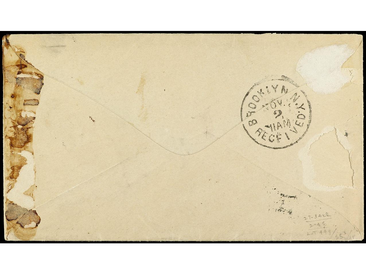 CUBA: OCUPACION ESTADOS UNIDOS. 1898 (julio?). SANTIAGO a NEW YORK. Dos sellos de 1 cto. habilitados con mat. ovalado de confección local MIL.STA. Nº1/SANTIAGO. MUY RARA. (Image1) (Image2)