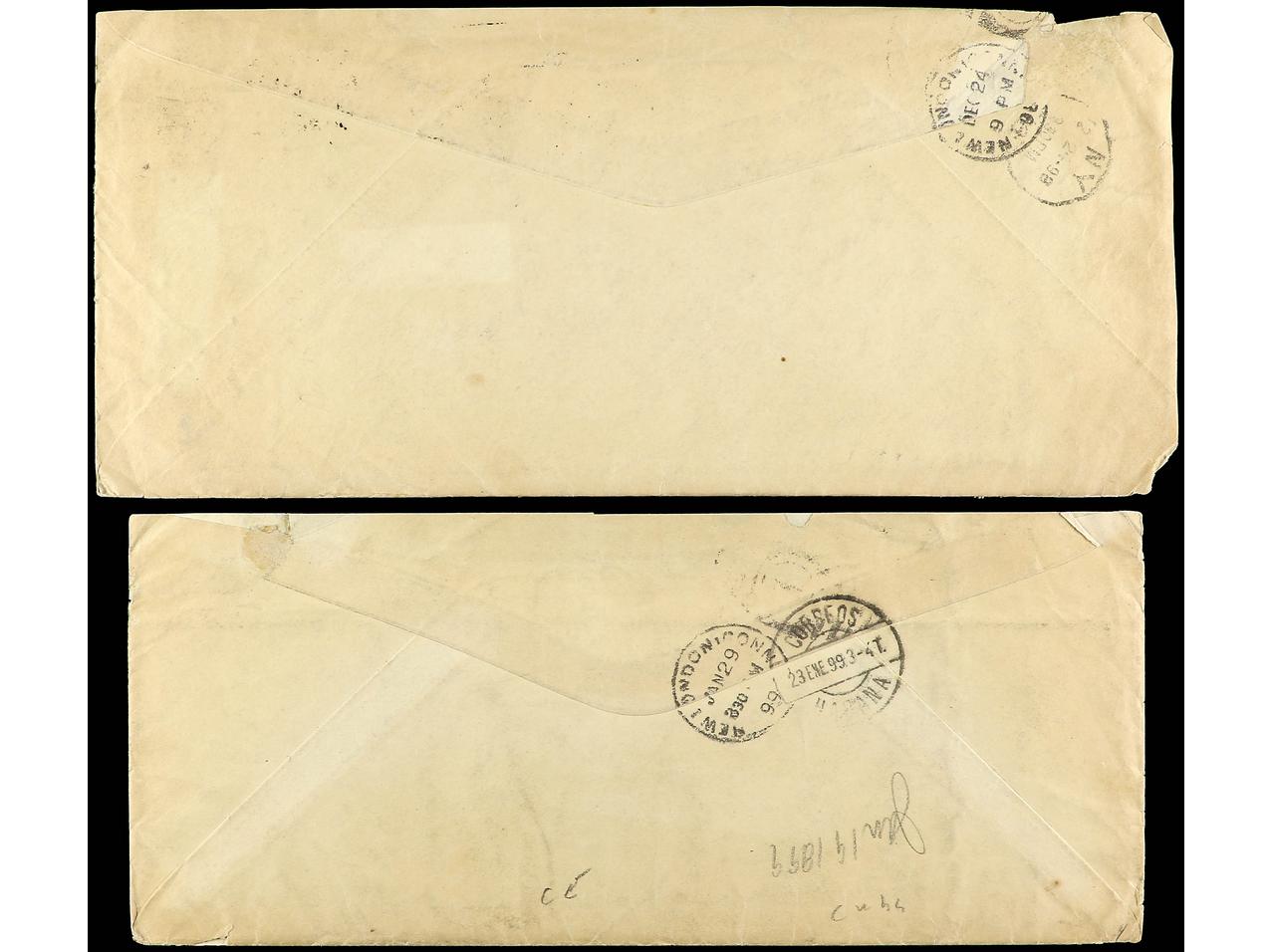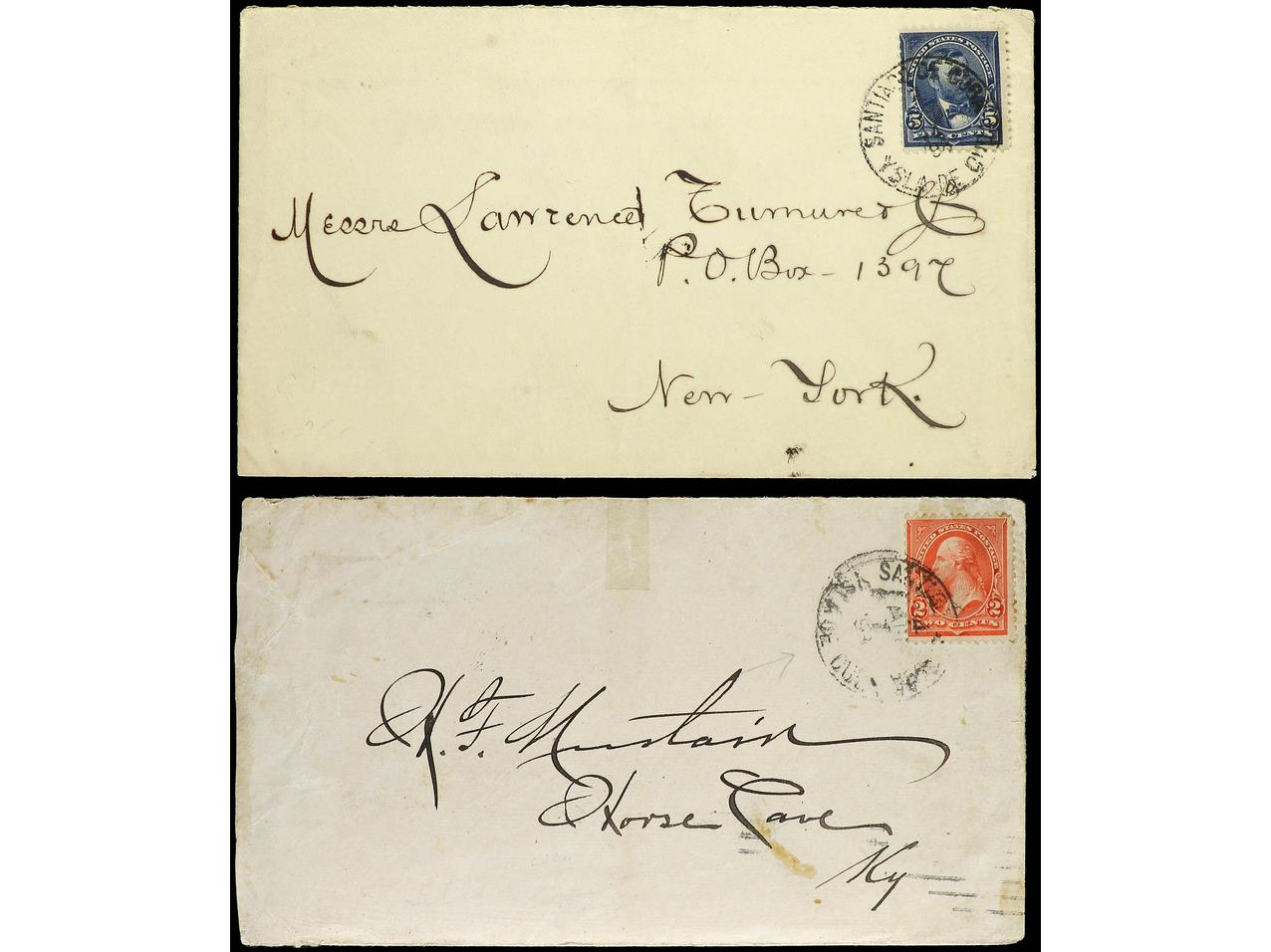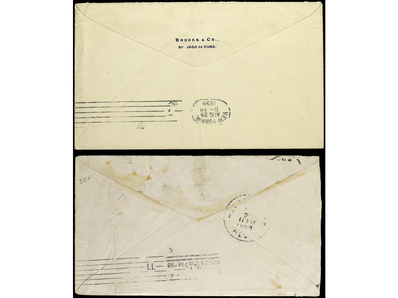 CUBA: OCUPACION ESTADOS UNIDOS. 1898 (agosto). Dos cartas circuladas con sellos US de 2 cts. rojo y 5 cts. azul con mat. español SANTIAGO DE CUBA/YSLA DE CUBA durante los primeros días de la Ocupación. (Image1) (Image2)