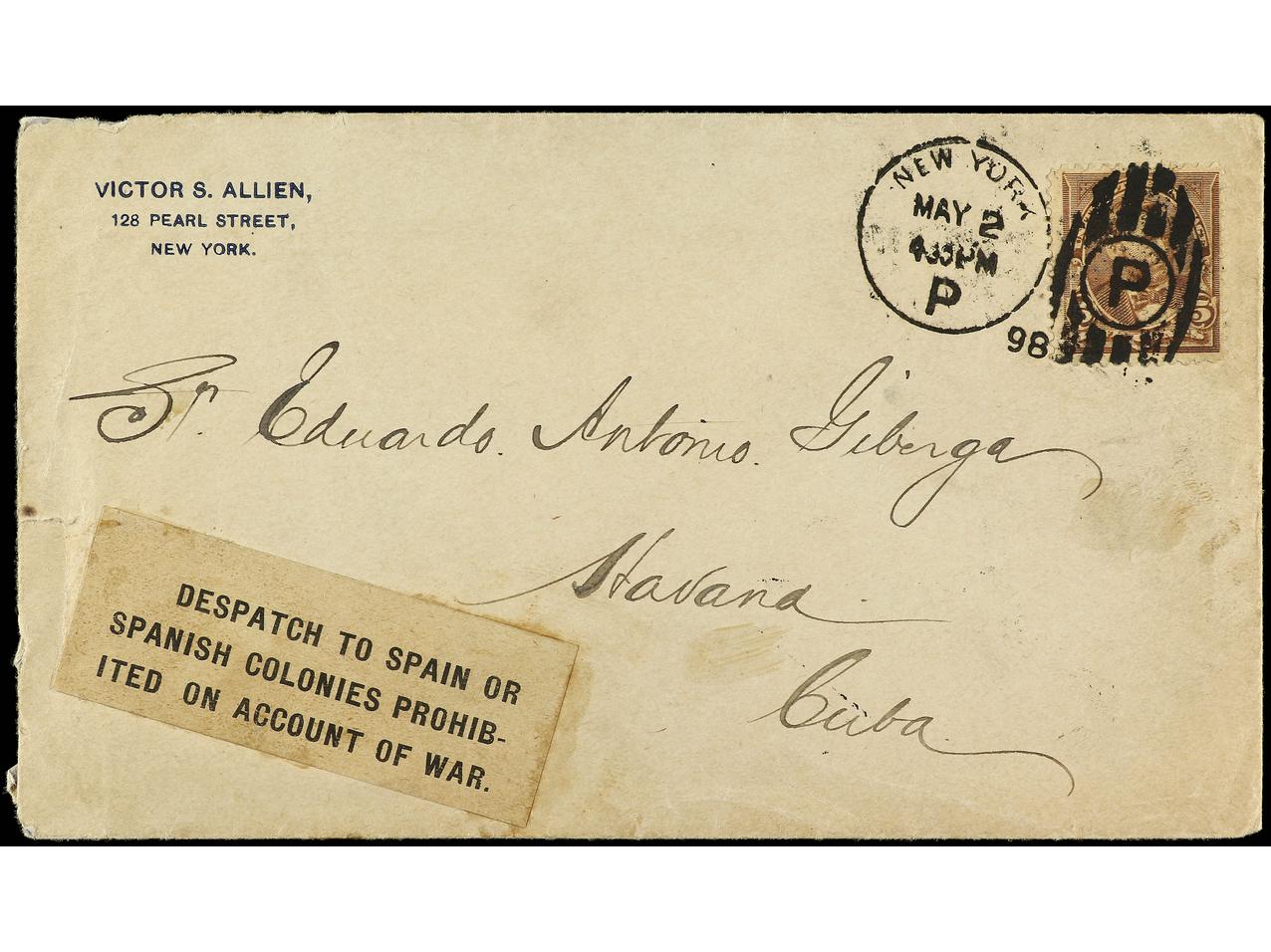 CUBA: OCUPACION ESTADOS UNIDOS. 1898. NEW YORK a HABANA. 5 cts. castaño rojo, etiqueta DESPATCH TO SPAIN OR SPANISH COLONIES PROHIBITED CON ACCOUNT OF WAR y devuelta al remitente. (Image1) (Image2)