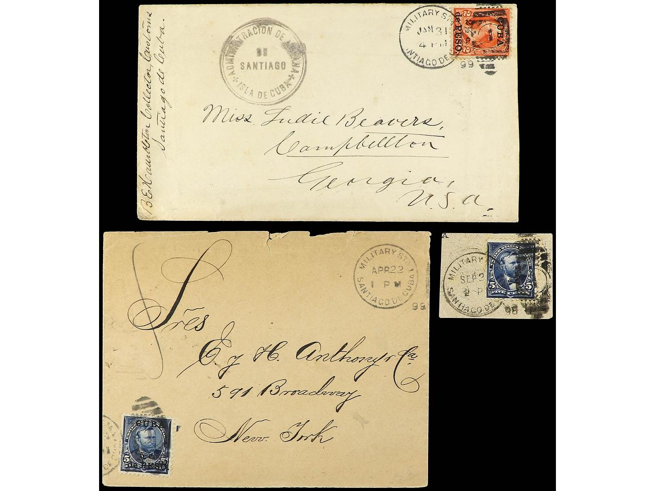 CUBA: OCUPACION ESTADOS UNIDOS. 1898-99. 5 cartas y un fragmento circuladas con sellos US y sellos US habilitados para Cuba con mat. MIL. STA. I/SANTIAGO DE CUBA. (Image1) (Image2)