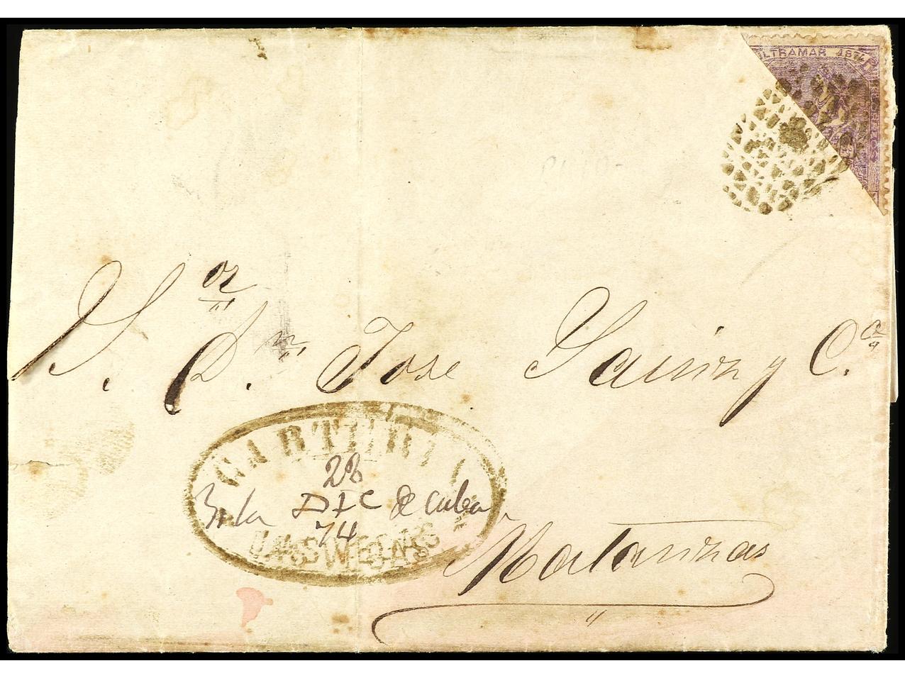 CUBA. 1874. LAS VEGAS a MATANZAS. 50 cts. violeta bisectado para ser usado como 25 cts. mat. parrilla ovalada de punto y marca ovalada CARTERIA / LAS VEGAS y fecha manuscrita. MUY RARA. (Image1) (Image2)