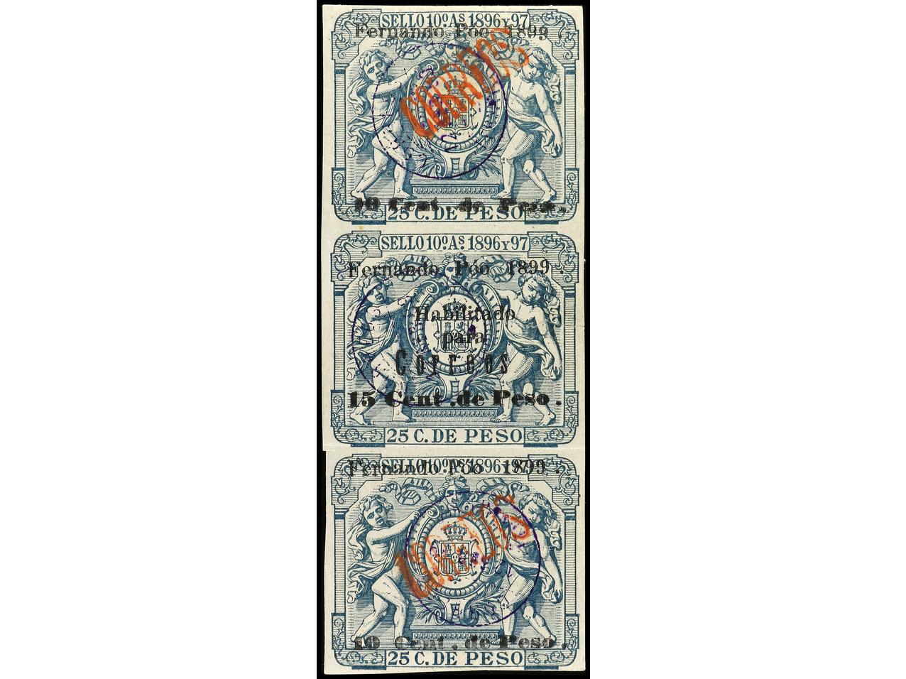 COLONIAS ESPAÑOLAS: FERNANDO POO. Tira de 3 con dos sellos, 10 c. s. 25 c. y 15 c. s. 25 c. RARO. Ed.47 F (2) + 47G. Cat. +445€. (Image1)