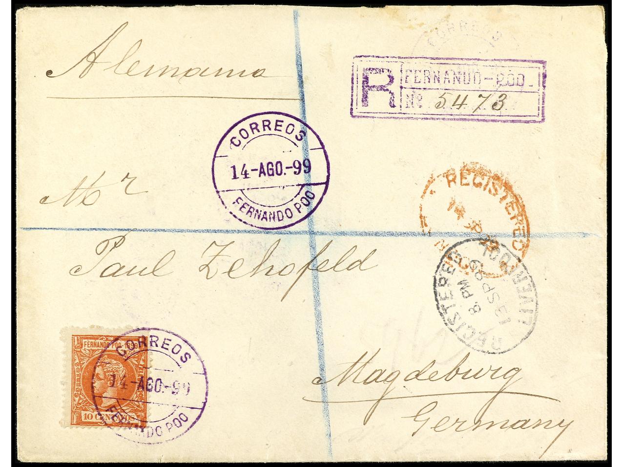 COLONIAS ESPAÑOLAS: FERNANDO POO. 1899. A ALEMANIA. 10 c., mat. fechador. Sobre certificado realmente circulado, aceptándose sello de 10 c., cuando la tarifa era de 75 c. RARO. Ed.64. (Image1) (Image2)
