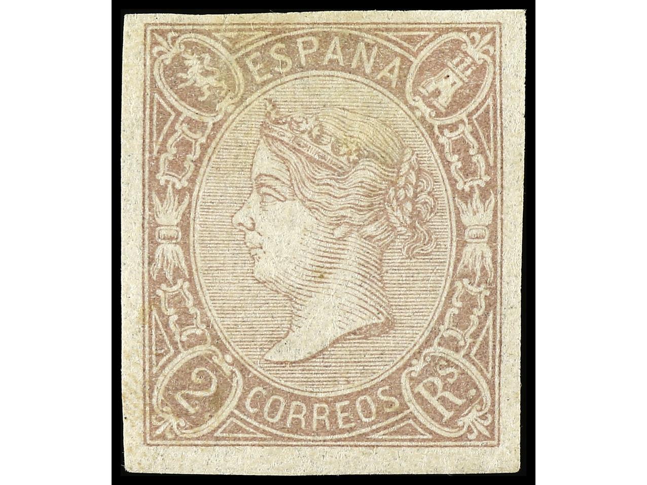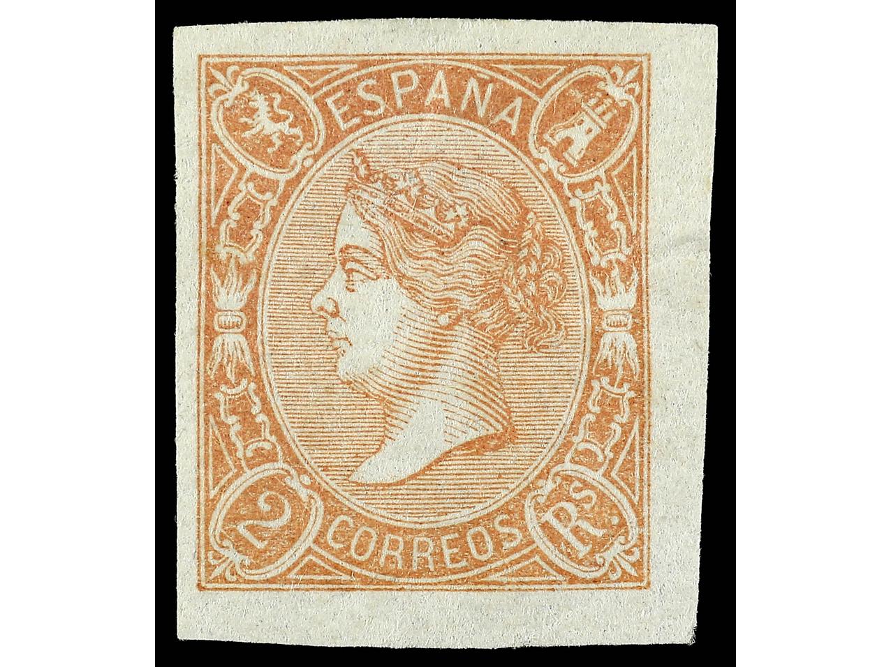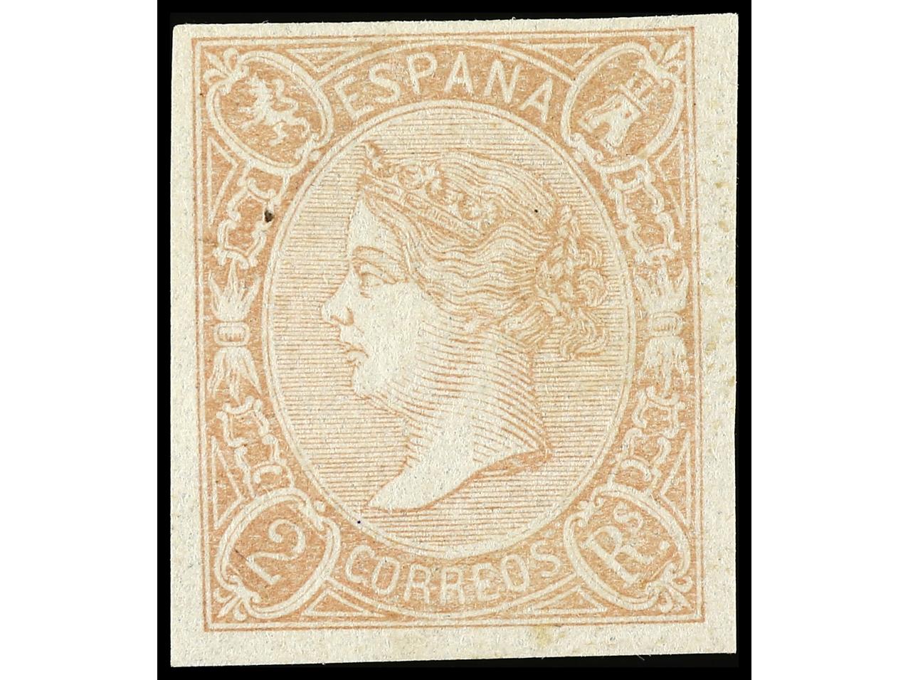 ESPAÑA. 2 reales amarillo castaño. Muy bonito pese a una pequeña arruga en el margen derecho. Ed.73A. (Image1)