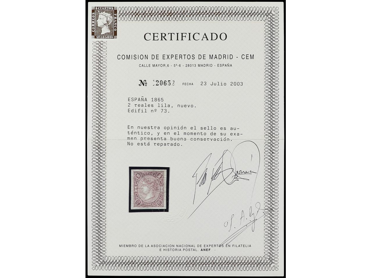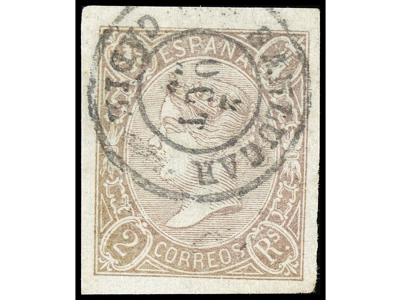 ESPAÑA. 2 reales violeta. Grandes márgenes. PIEZA DE LUJO. Cert. CEM. Ed.73. Cat. 540€. (Image1) (Image2)