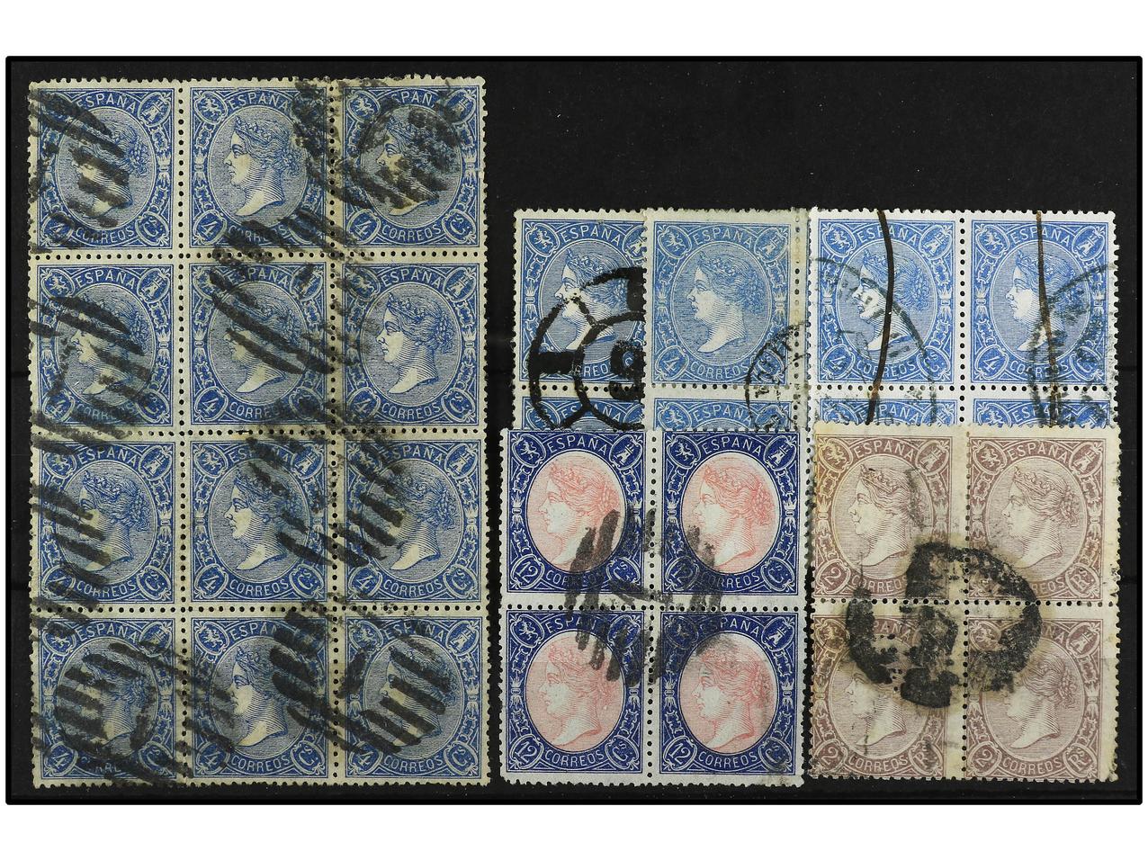 ESPAÑA. 4 cuart. 3 bloques de cuatro, 12 cuartos bloque de cuatro y 2 reales bloque de cuatro. Ed.75, 76, 79. (Image1)