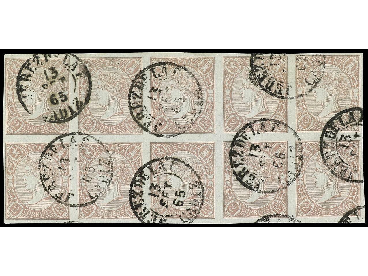 ESPAÑA. 2 reales lila. Bloque de diez. mat. fechador. JEREZ DE LA F./CADIZ. PRECIOSO. Cert. COMEX. Ed.73 (10). (Image1) (Image2)