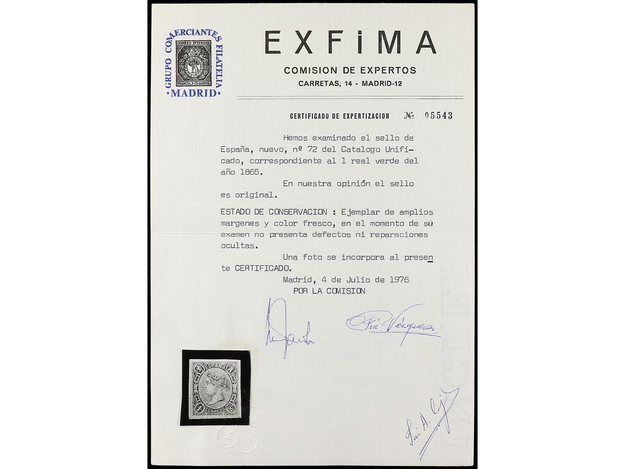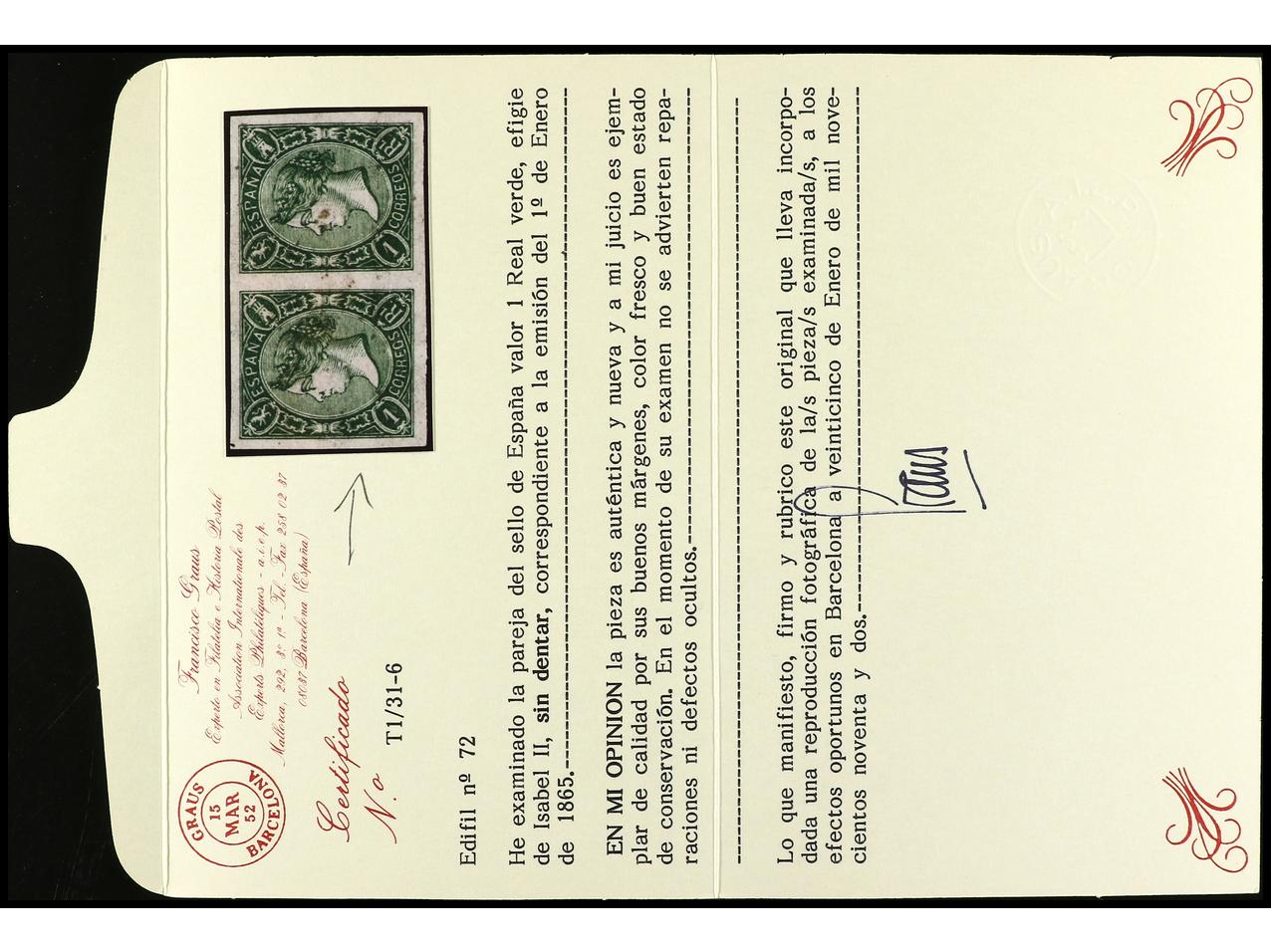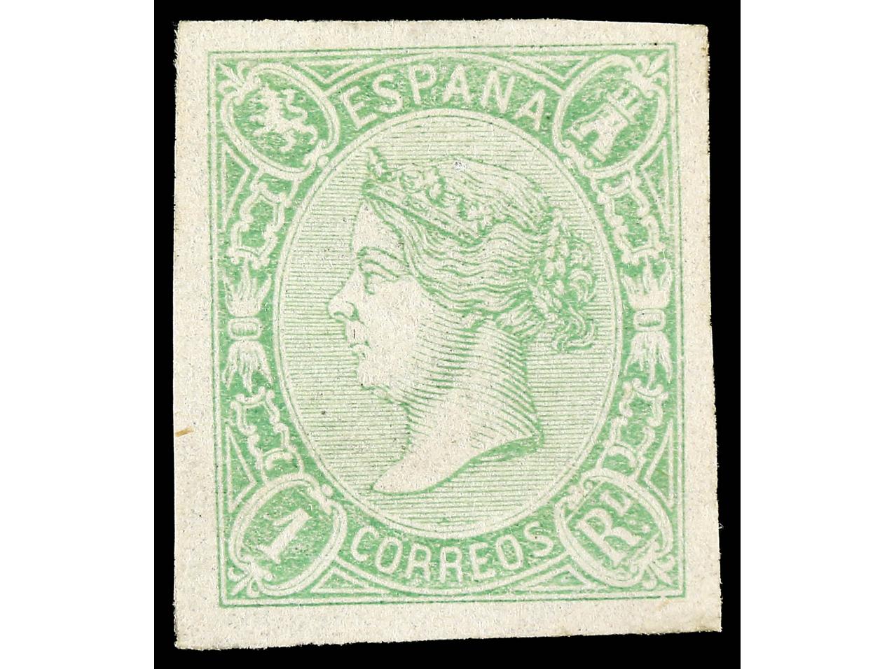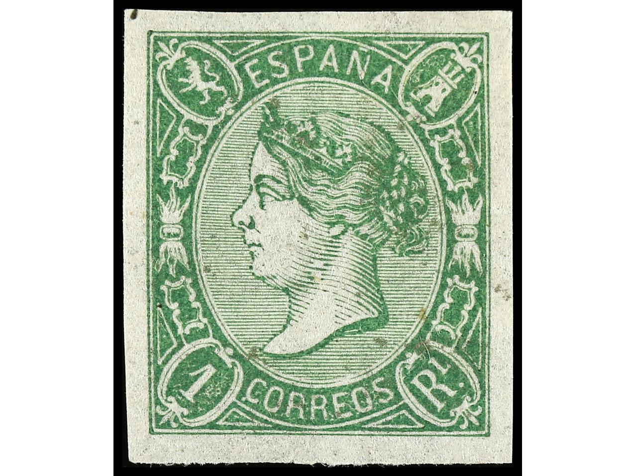 ESPAÑA. 1 real verde. Color y márgenes excepcionales. PIEZA DE LUJO. Cert. GRAUS (de la pareja de dónde procede). Ed.72. Cat. 550€. (Image1) (Image2)
