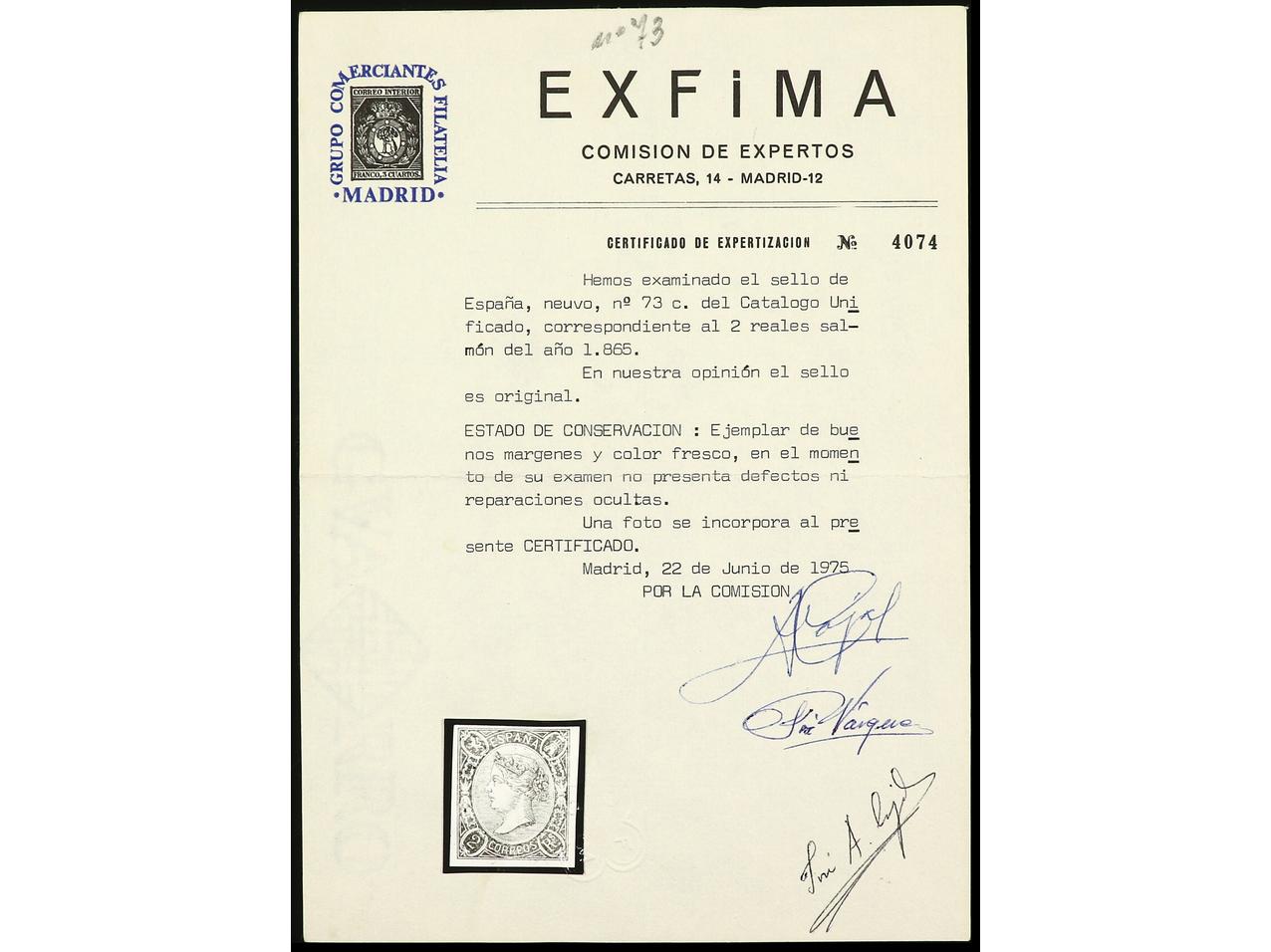 ESPAÑA. 2 reales salmón. Buen ejemplar. Cert. EXFIMA (1975). Ed.73A. (Image1) (Image2)