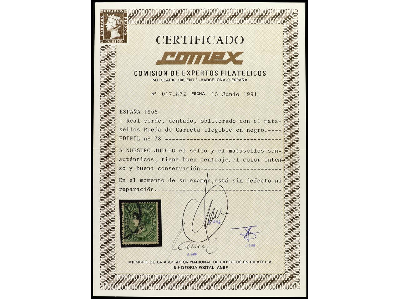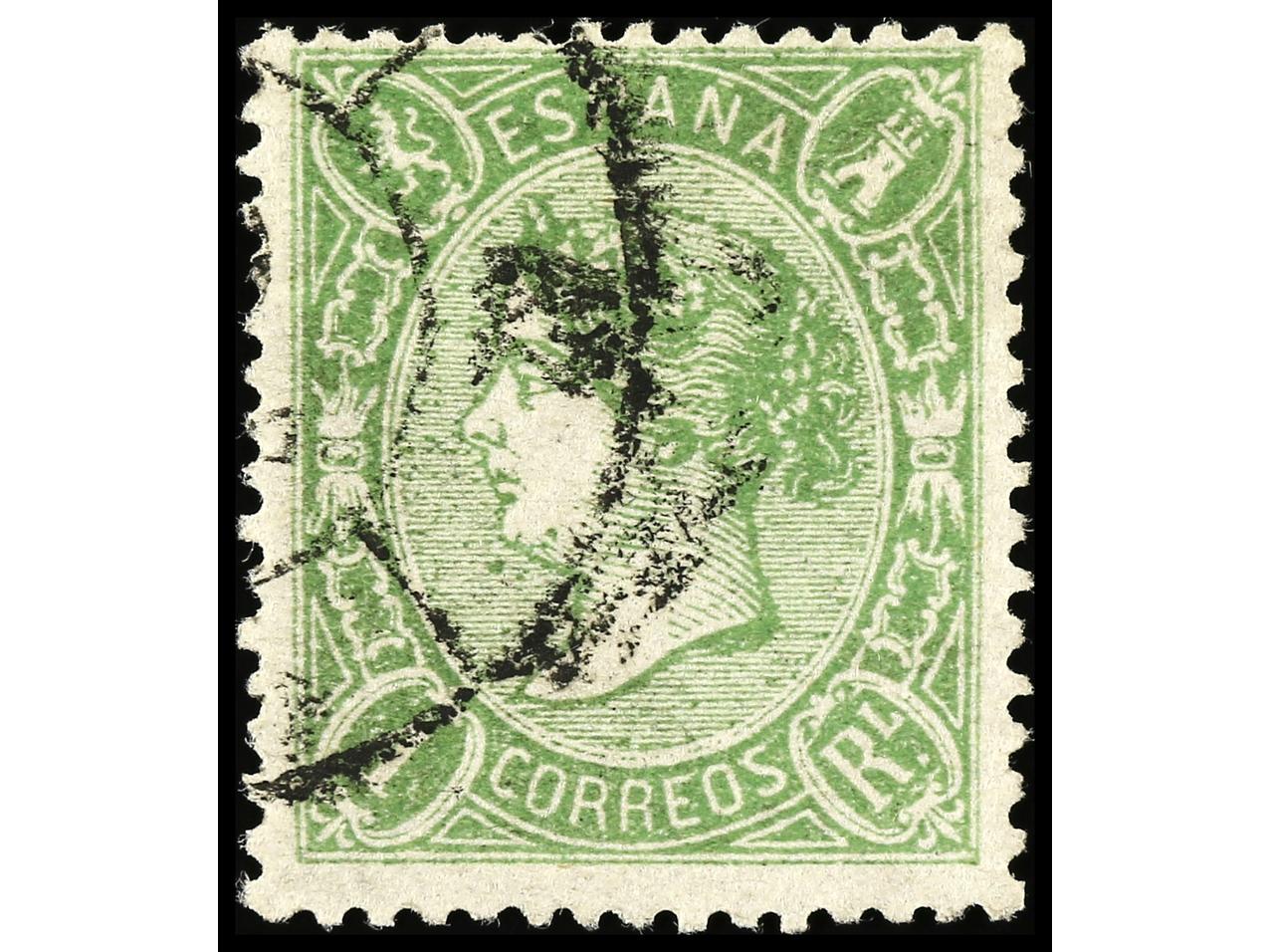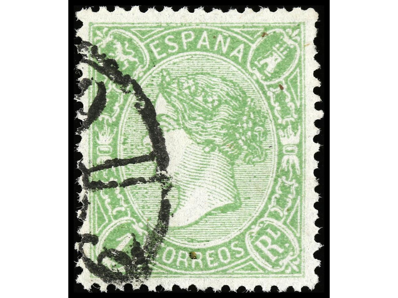 ESPAÑA. 1 real verde. Mat. RC MUY BIEN CENTRADO, color intenso y fino matasello. MUY RARO en esta calidad. Cert. COMEX. Ed.78. Cat. 800€. (Image1) (Image2)