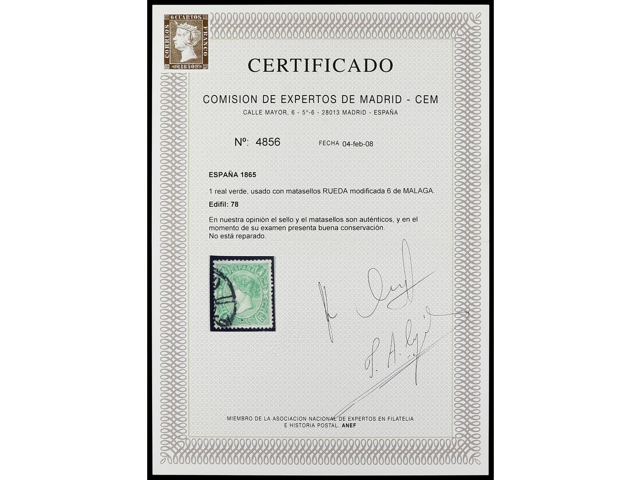 ESPAÑA. 1 real verde, mat. R.C. 9 de Alicante modificada. Centraje perfecto, rarísimo en esta emisión. LUJO. Cert. CEM. Ed.78. Cat. 800€. (Image1) (Image2)