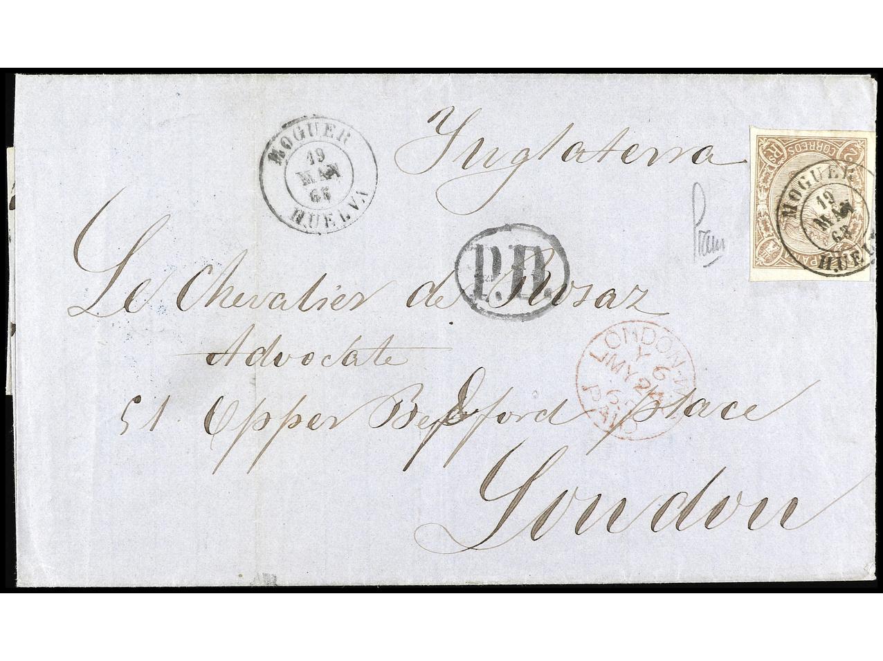 ESPAÑA. 1865. MOGUER a LONDRES. 2 reales lila, mat. fechador MOGUER/HUELVA. PRECIOSA. Firmado GRAUS. Ed.73. (Image1) (Image2)