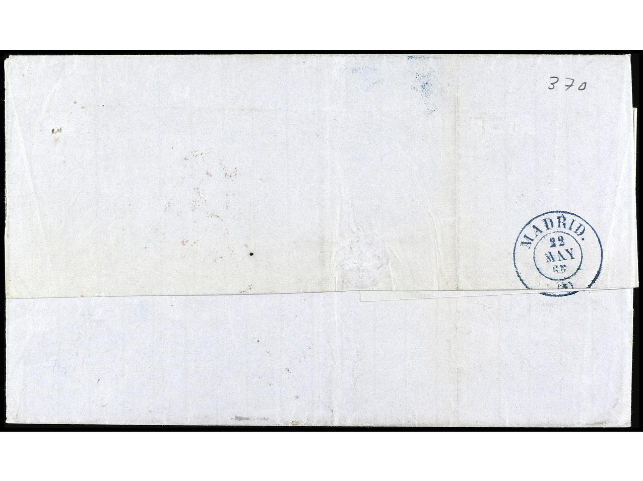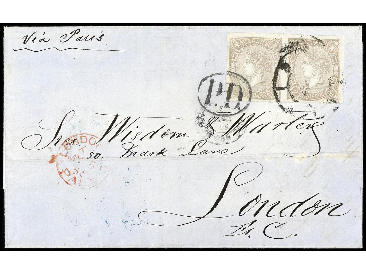 ESPAÑA. 1865. JÉREZ a LONDRES. 2 reales gris (2). Rara tonalidad de color en carta. Doble porte a Inglaterra, en el frente llegada. Cert. GRAUS. Ed.73c (2).