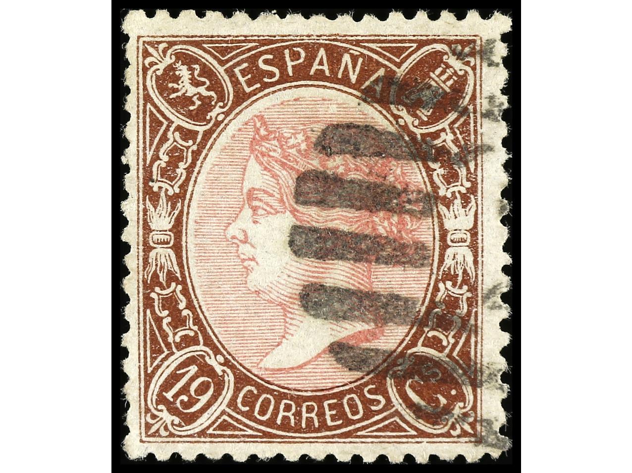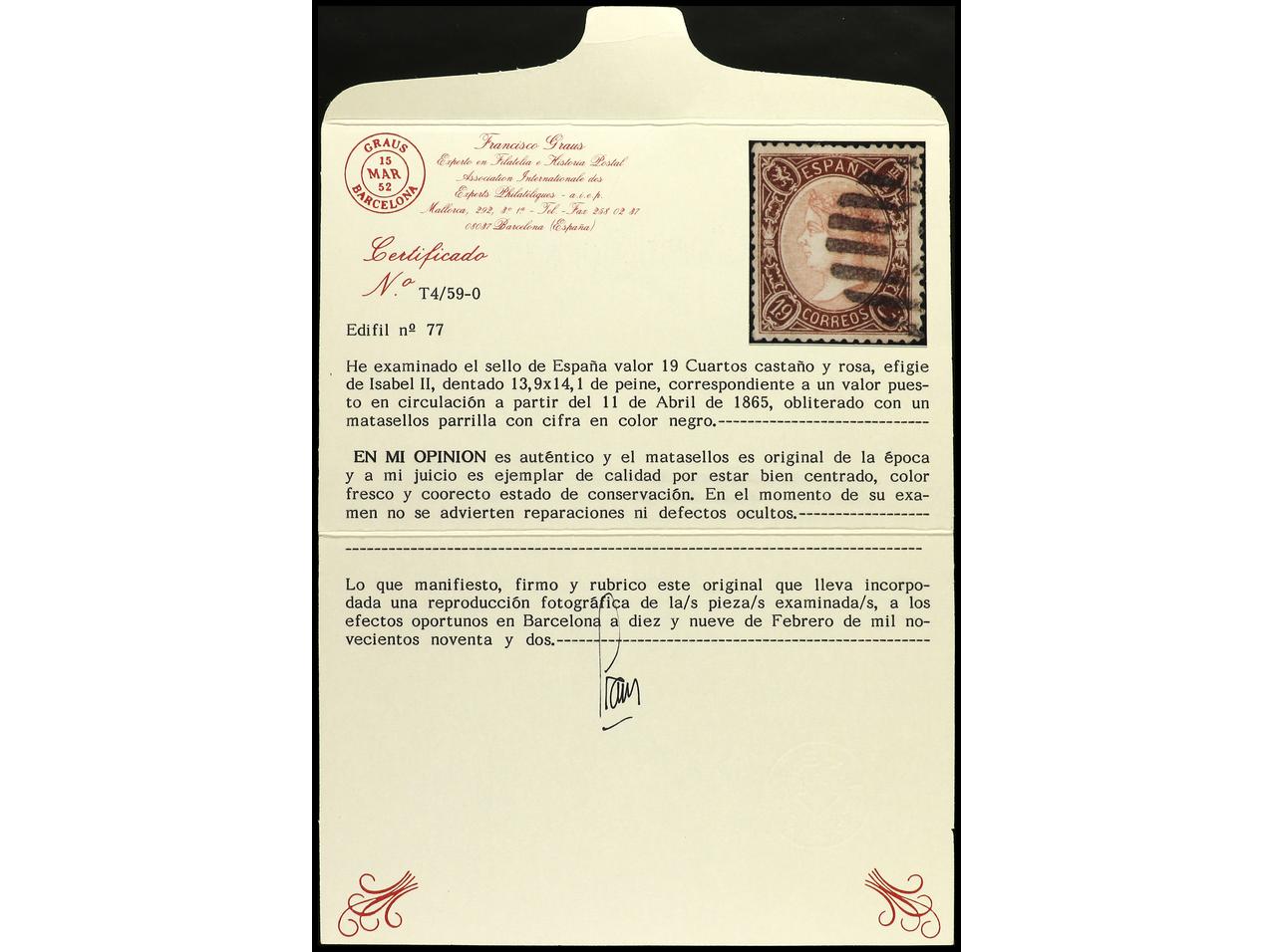 ESPAÑA. 19 cuartos castaño y rosa. MUY BIEN CENTRADO y fino matasello. MUY RARO en esta calidad. Cert. GRAUS (ejemplar de calidad) y EXFIMA. Ed.77.