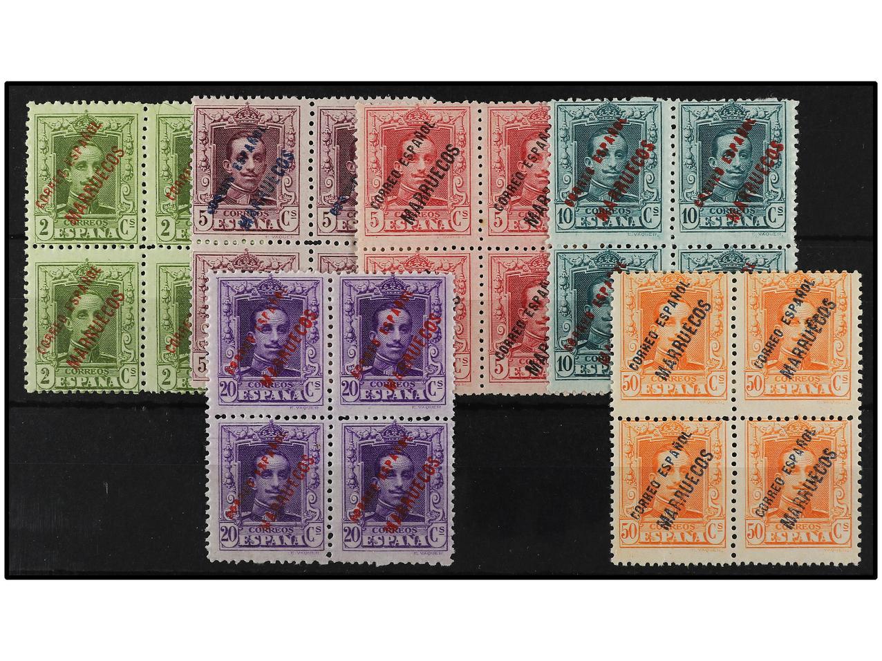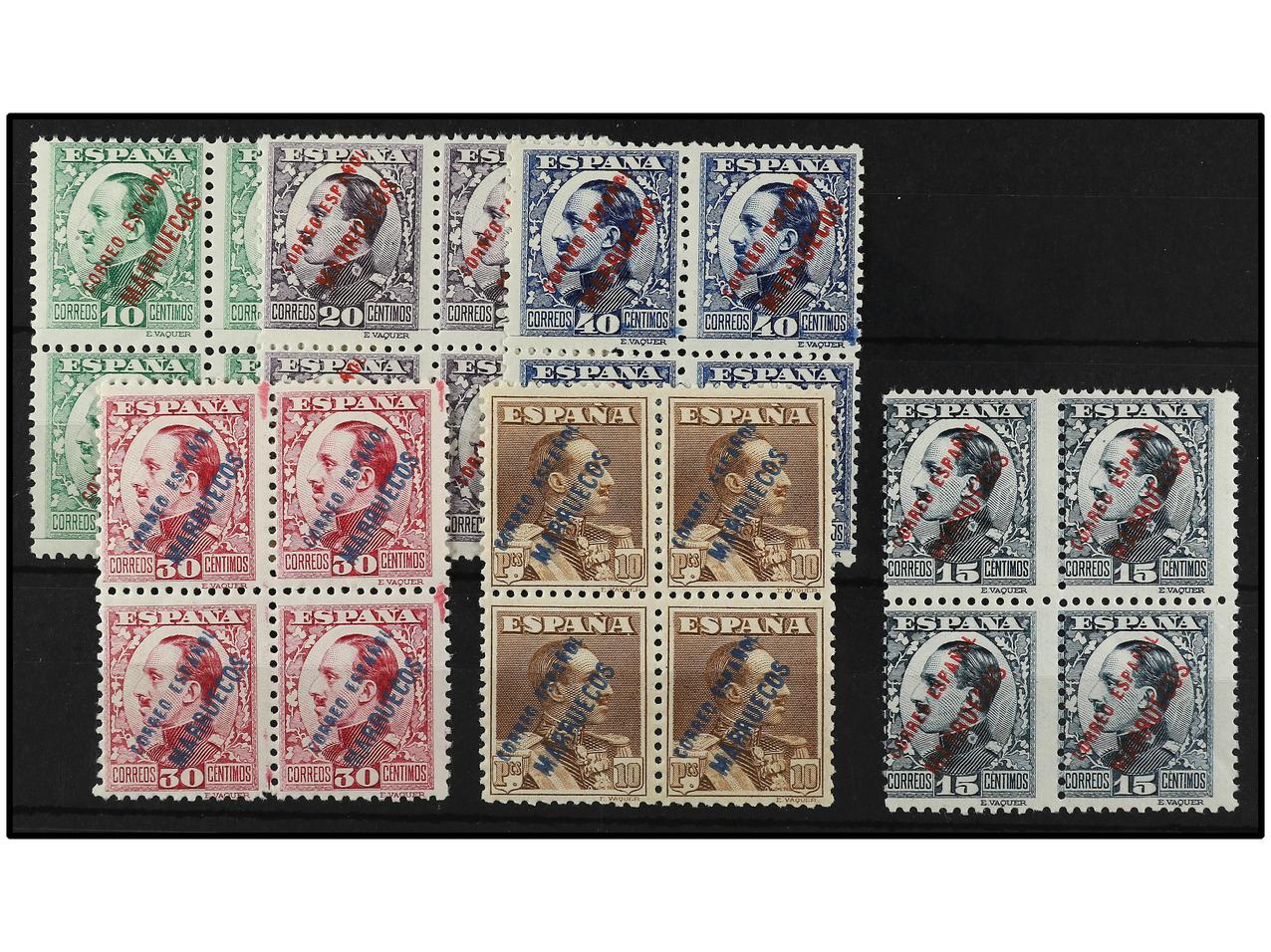 COLONIAS ESPAÑOLAS: TANGER. SERIE COMPLETA. 6 valores en BLOQUES DE CUATRO. 15 c.centrado habitual. Ed.64/9. Cat. 1.660€. (Image1) (Image2)