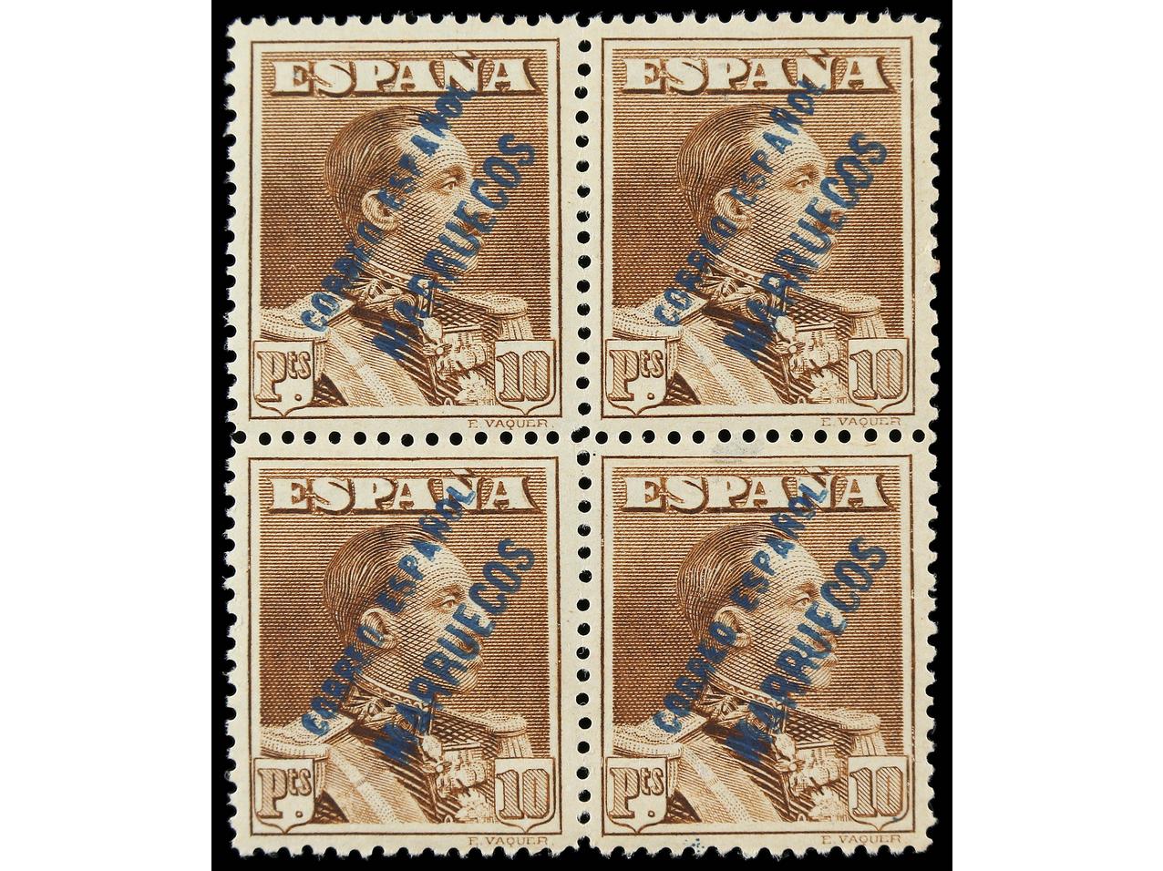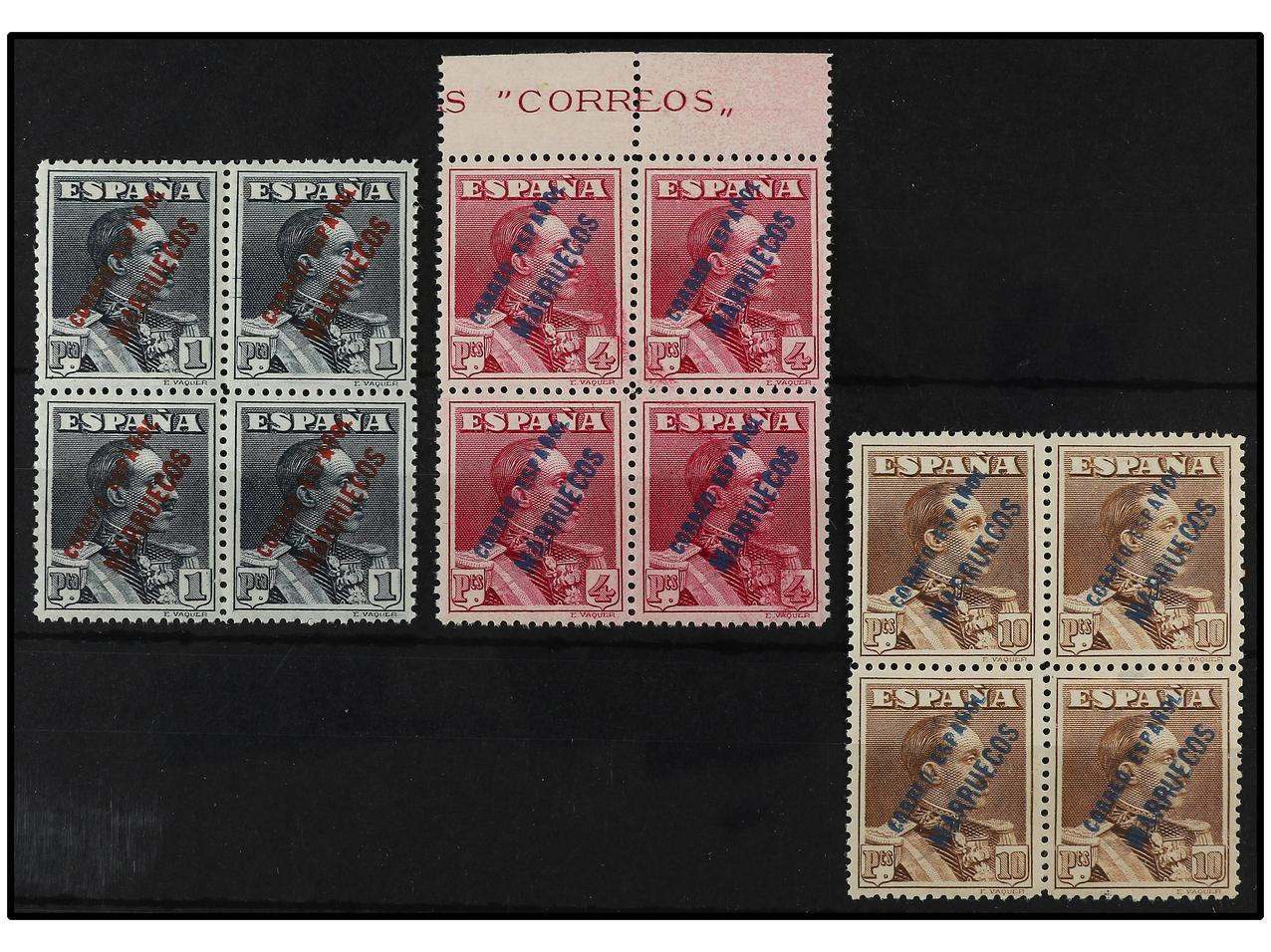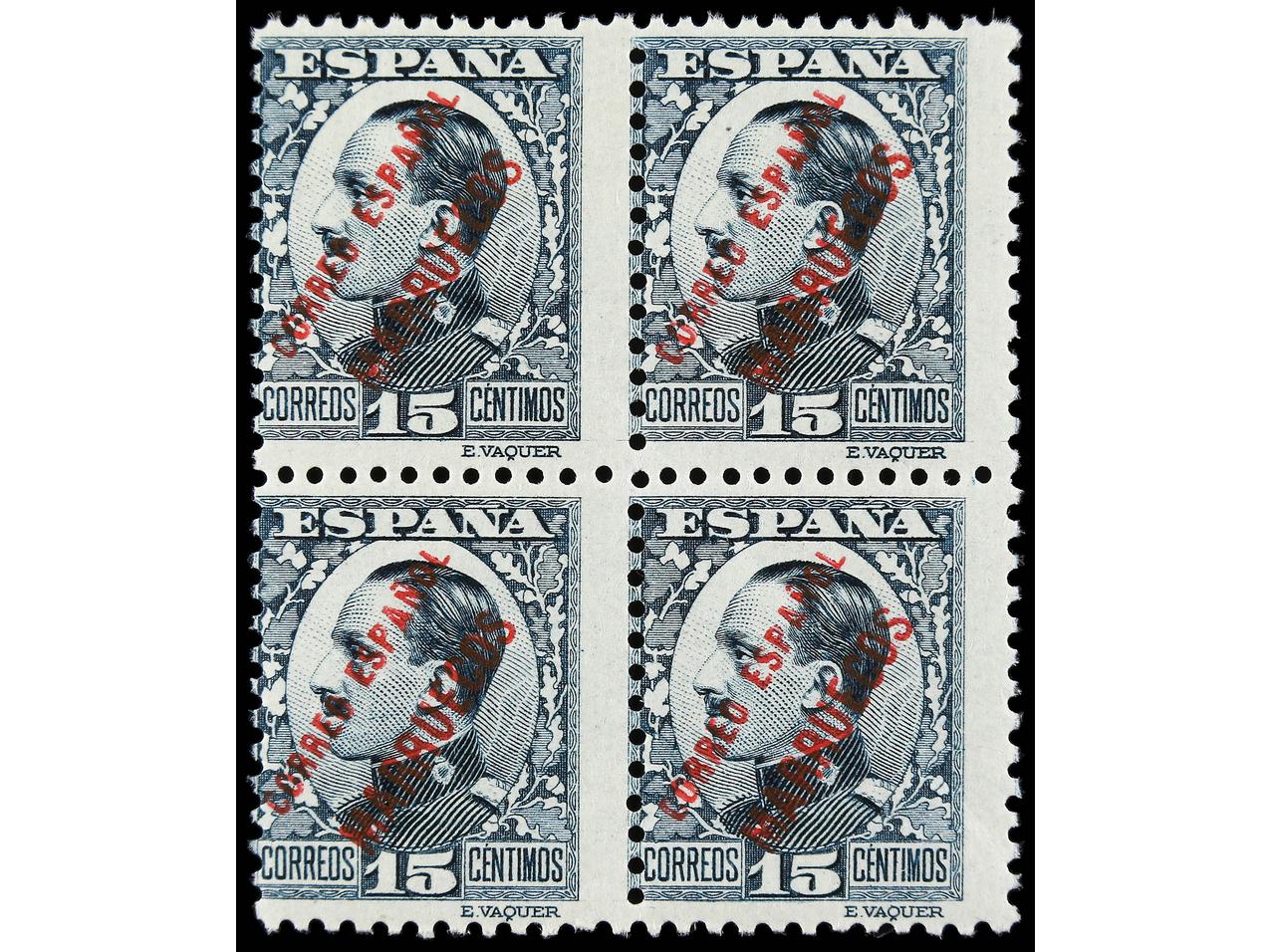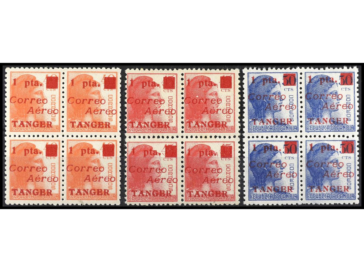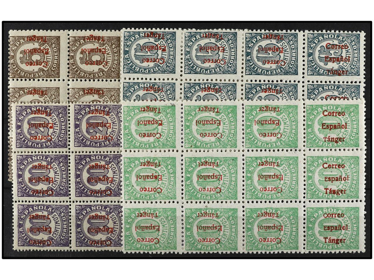 COLONIAS ESPAÑOLAS: TANGER. Tres valores ERRORES DE COLOR EN LA HABILITACIÓN. Bloques de cuatro. Ed.NE 13/15hcc. Cat. 300€. (Image1)