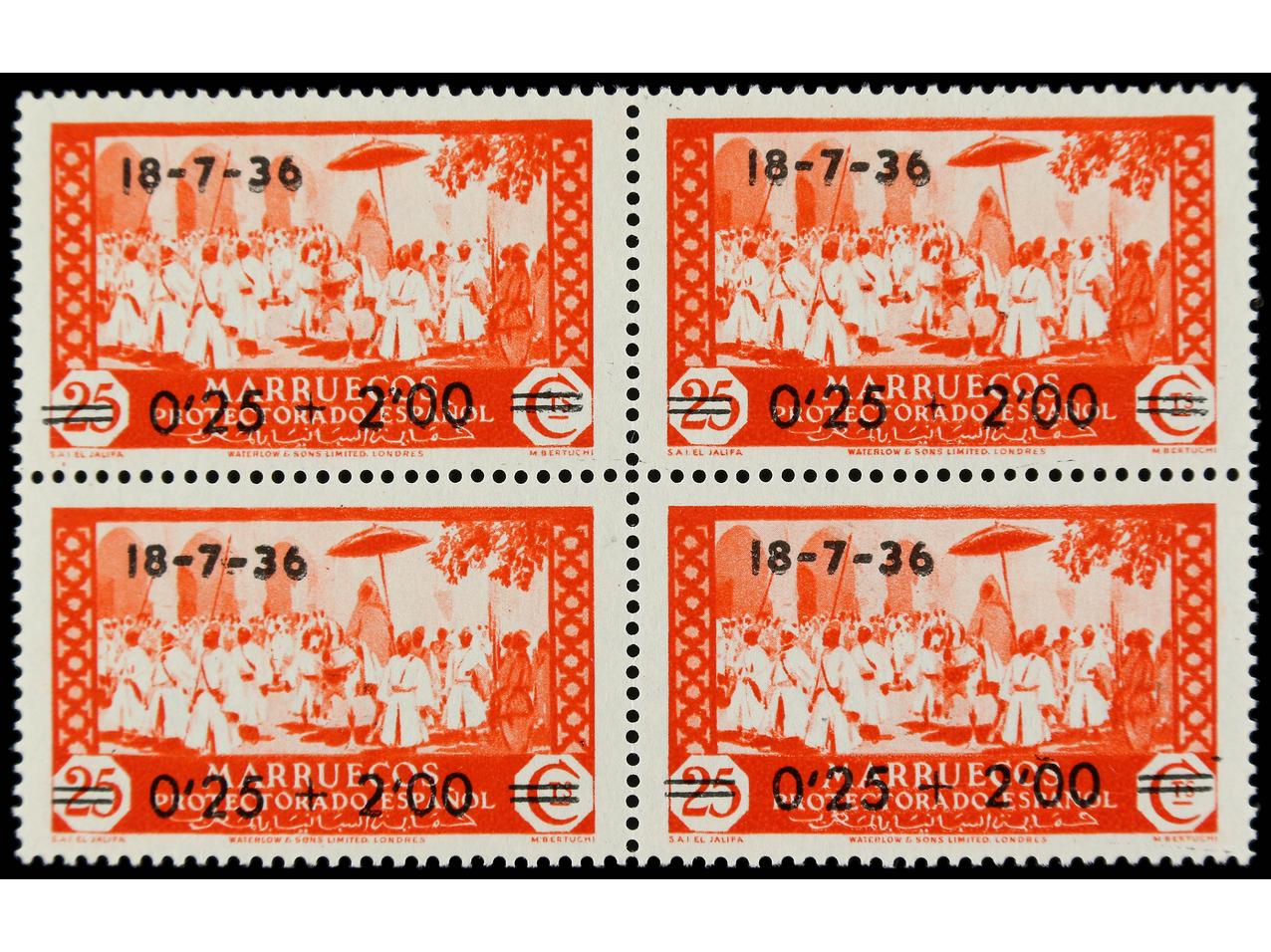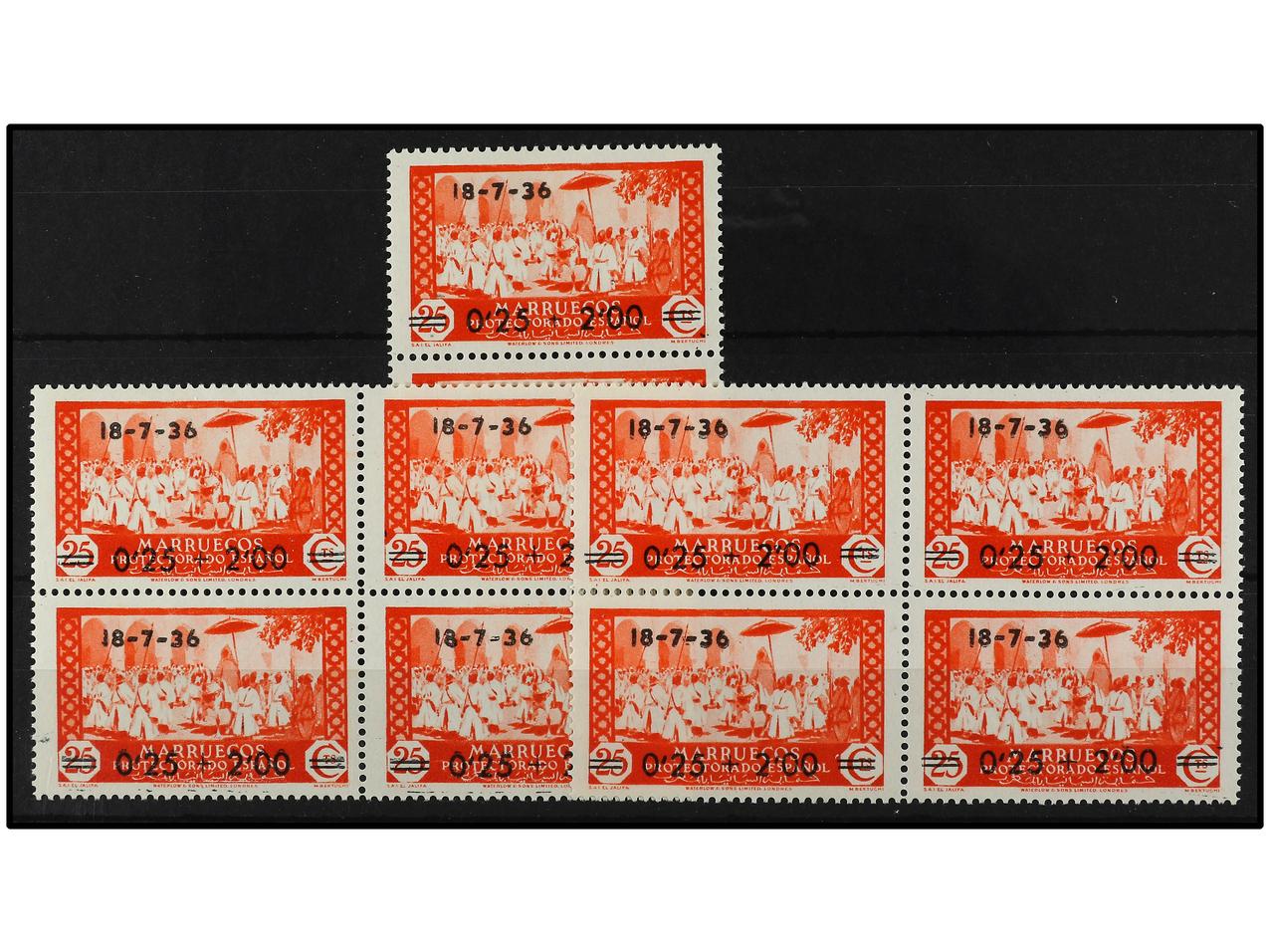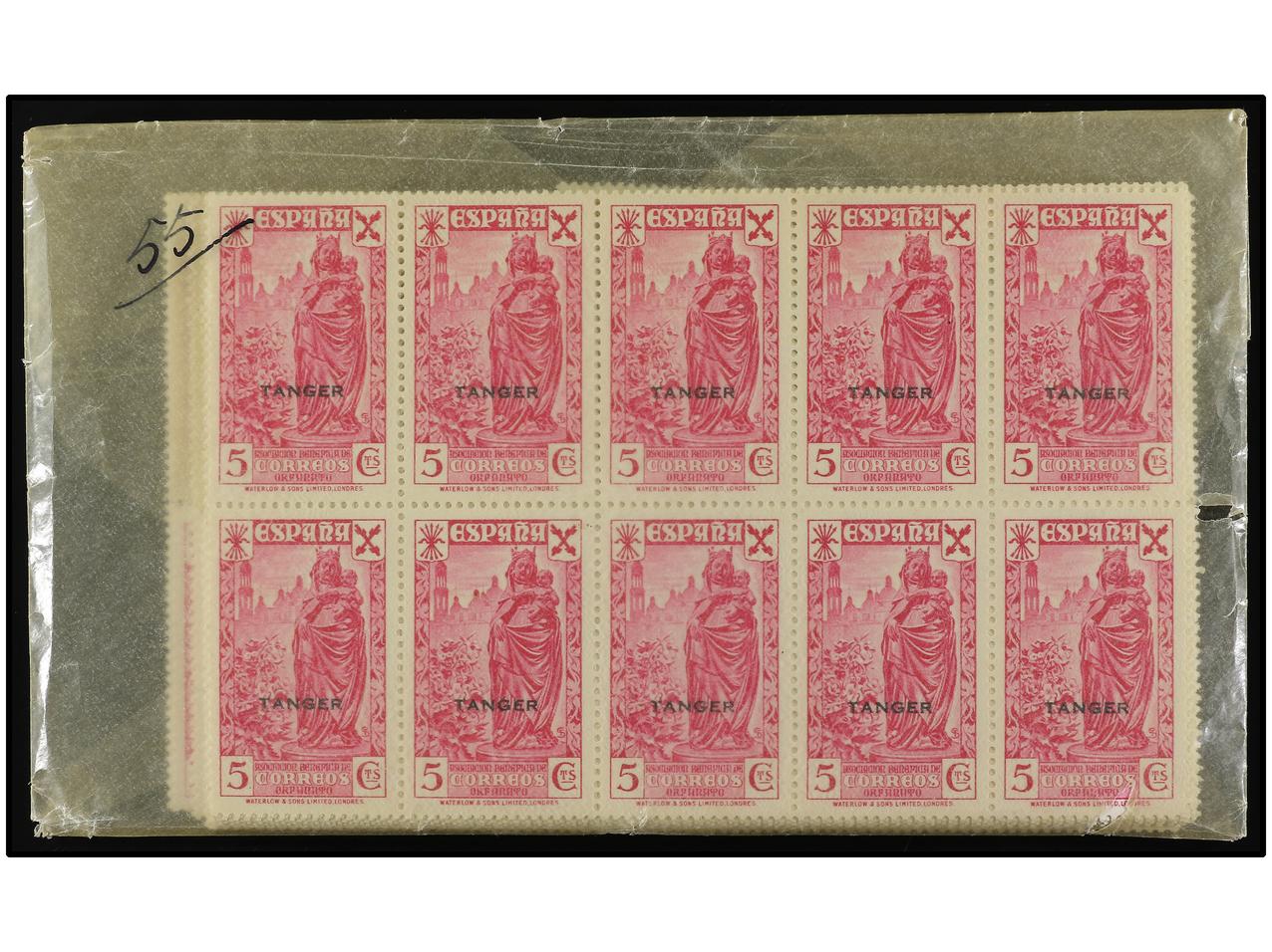 COLONIAS ESPAÑOLAS: TANGER. 0,25+2,00 pts. sobre 25 cts. rojo. 10 sellos en pareja y bloques. LUJO. Ed.161 (10). Cat. 1.000€. (Image1) (Image2)