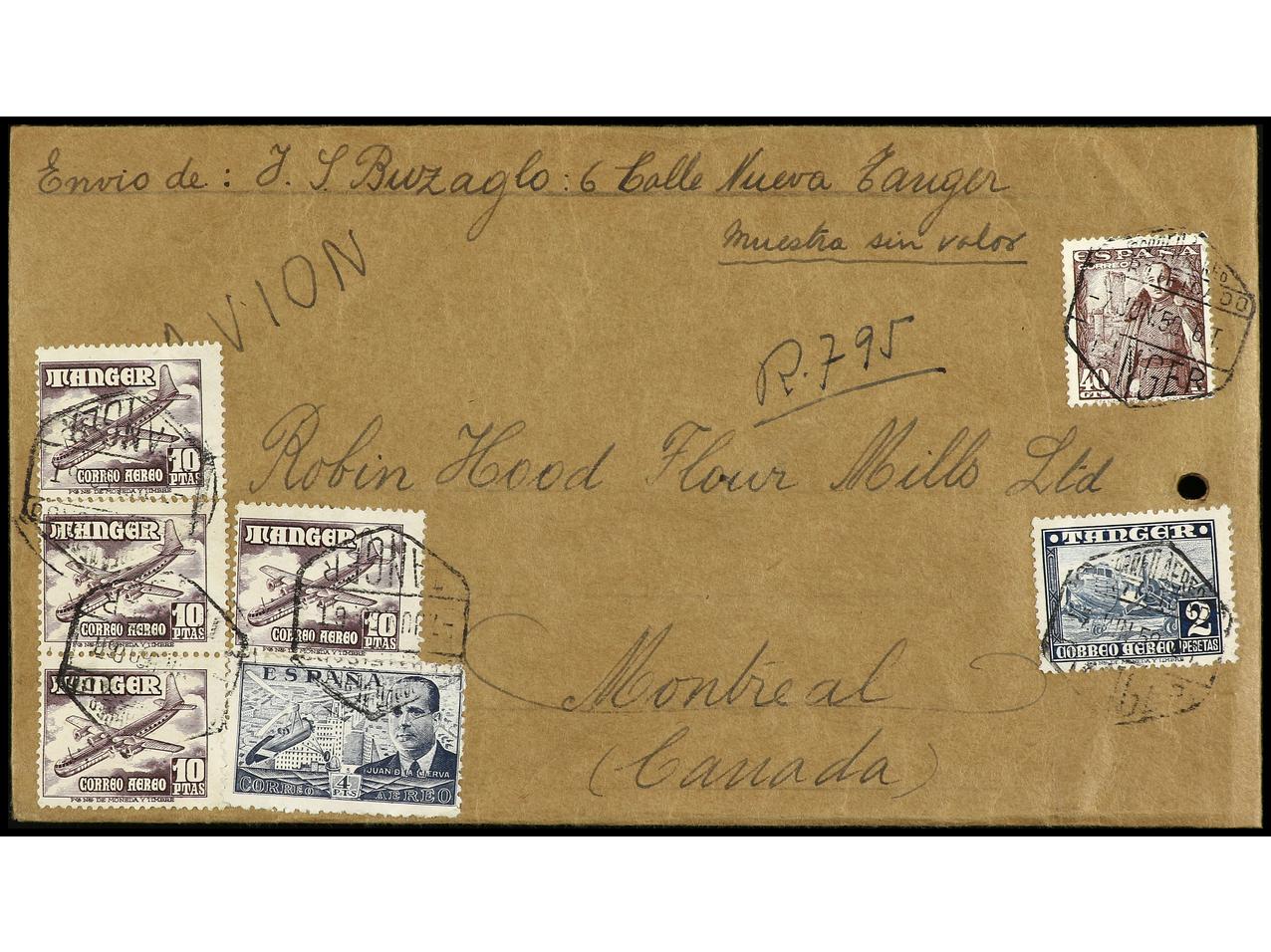 COLONIAS ESPAÑOLAS: TANGER. 1950. Sobre MUESTRA SIN VALOR certificado, de TÁNGER a CANADÁ. 2 pts. y 10 pts. (4) más España 4 pts. y 40 c. (Ed. 946 y 1027). Al dorso llegada y tránsitos. Raro franqueo. Ed.170 y 171 (4). (Image1) (Image2)