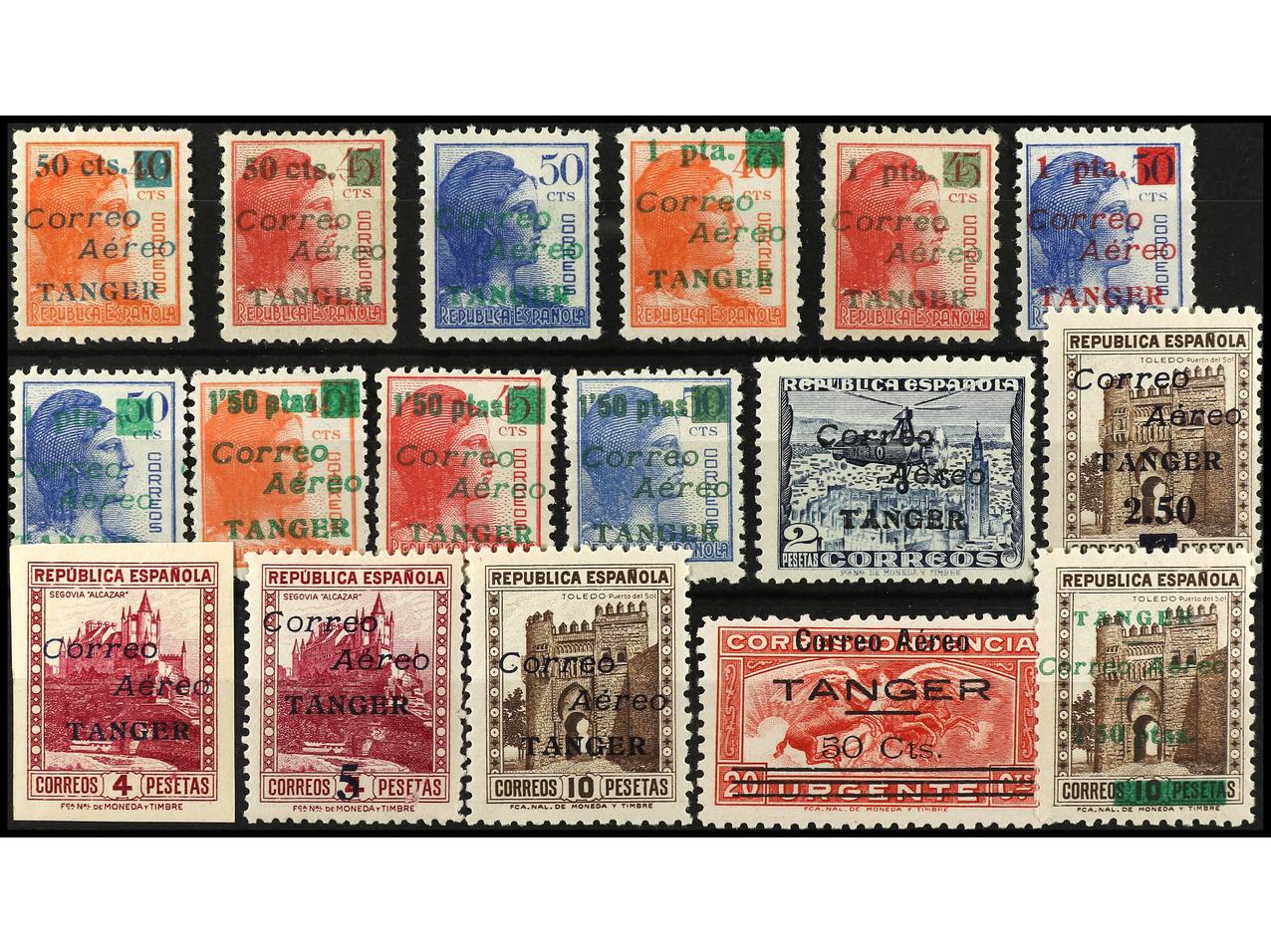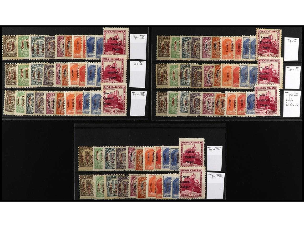 COLONIAS ESPAÑOLAS: TANGER. Conjunto de las ocho variedades de composición según Gálvez a falta de sello de 2 pts. aéreo y en el tipo III el 60cts. Tipo I (T pequeñas) Tipo II (C, E, T grandes), Tipo III (C, E pequeñas), Tipo IV (E