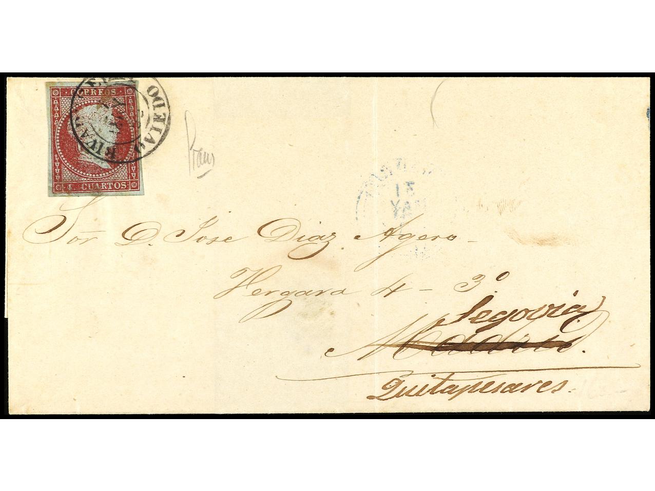 ESPAÑA. 1855. RIVADESELLA a SEGOVIA. 4 cuartos carmín, mat. fechador RIVADESELLA/OVIEDO. PRECIOSA. Firmada GRAUS. Ed.40. (Image1) (Image2)