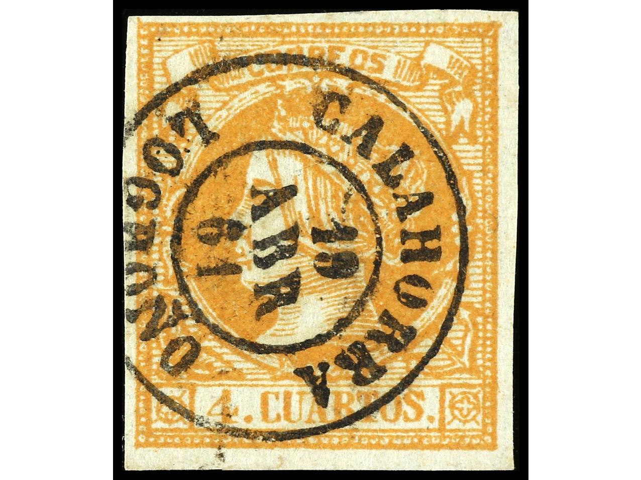 ESPAÑA. 4 cuartos amarillo FALSO POSTAL tipo VI, mat. fechador CALAHORRA/LOGROÑO. Muy raro usado en esta localidad. Ed.52F. (Image1)