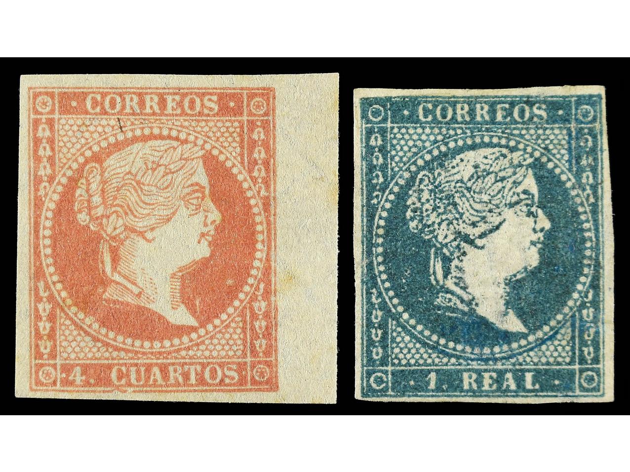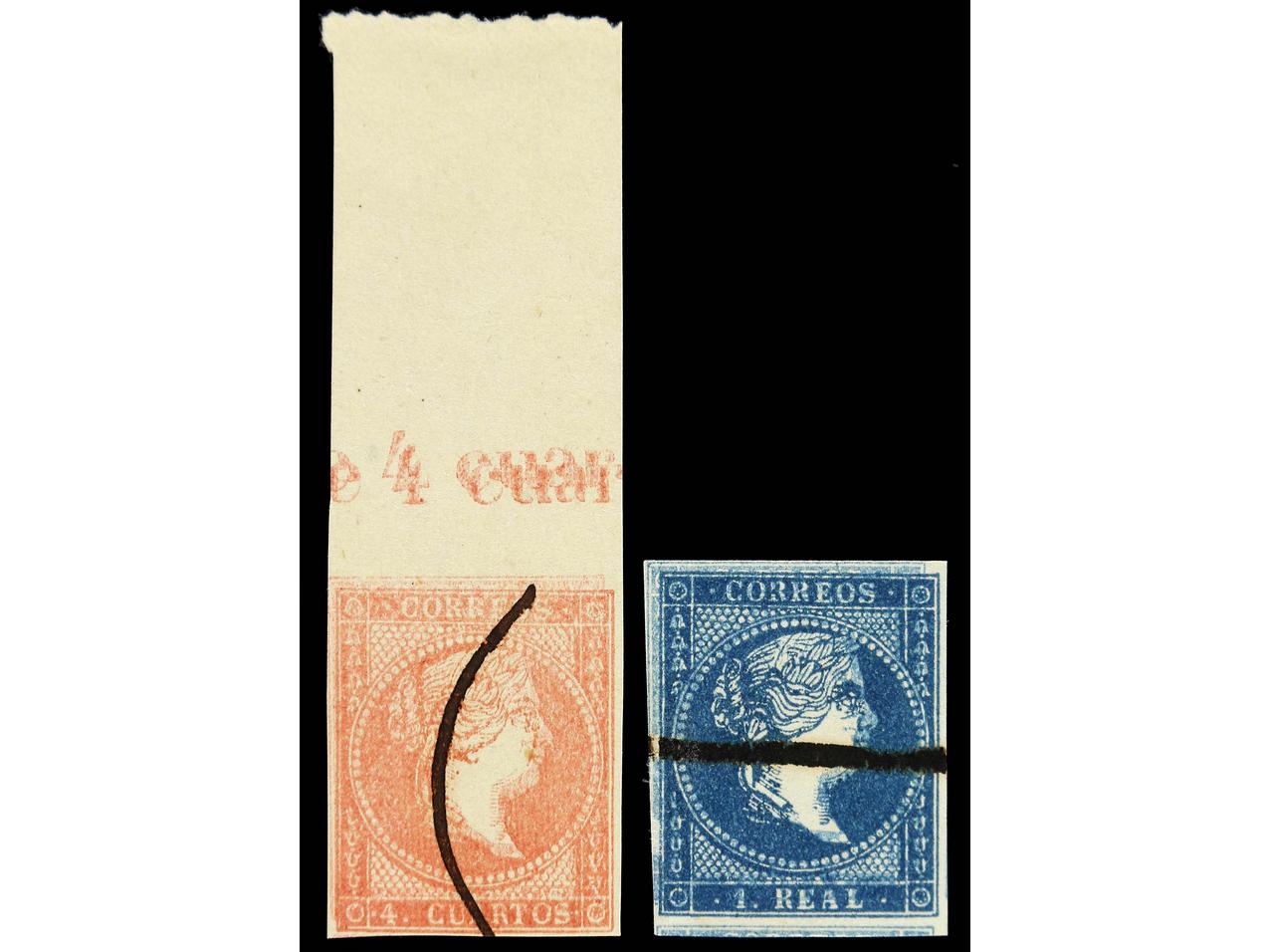 ESPAÑA. 4 cuartos rojo y 1 real azul DOBLE IMPRESIÓN anulados a pluma, sólo existen así. Ed.48ed y 49ed. (Image1)