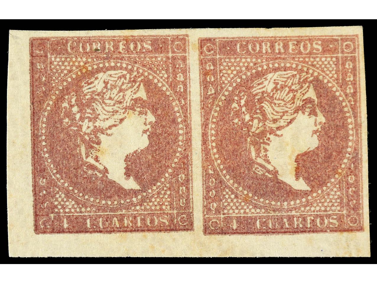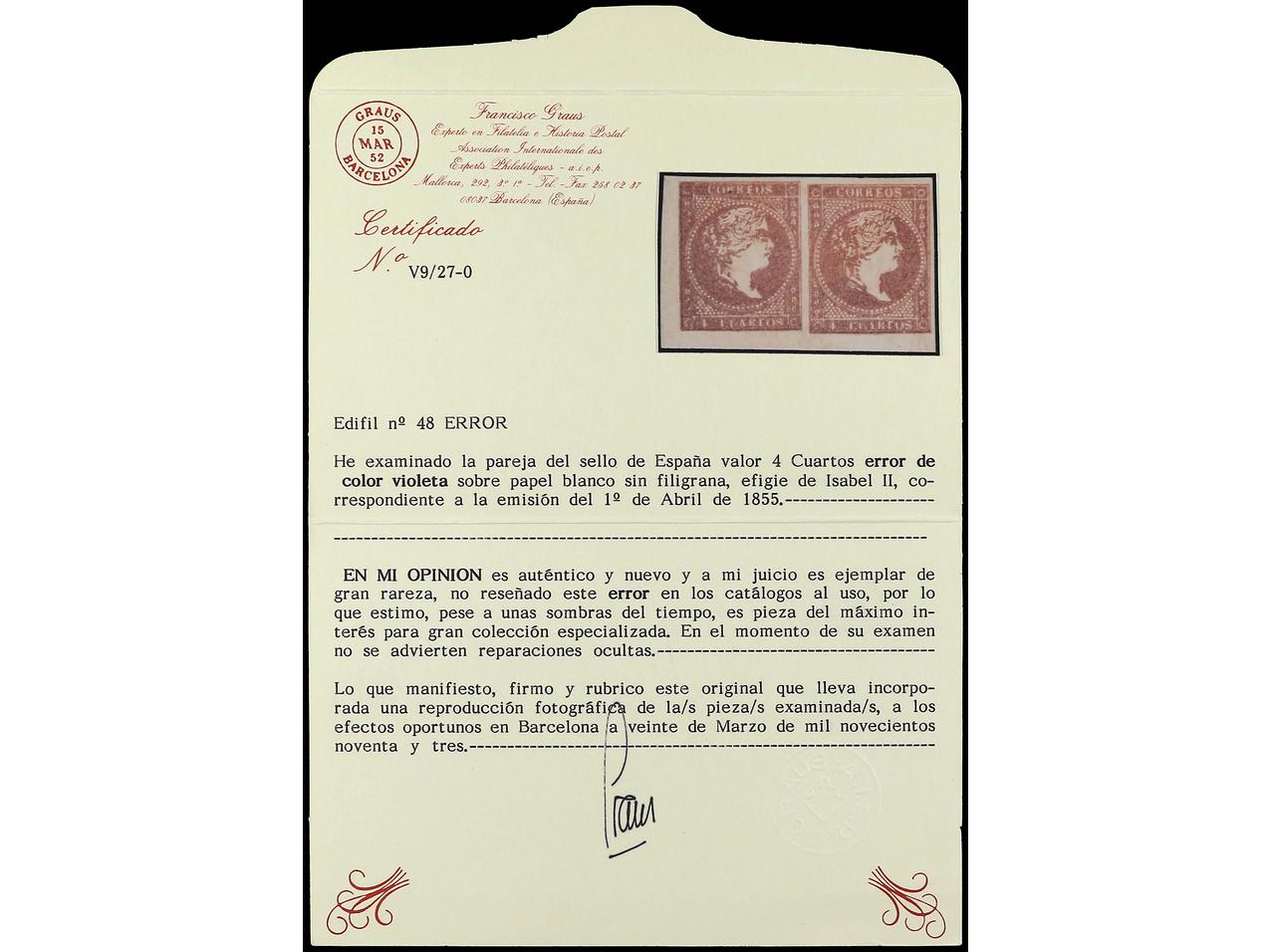 ESPAÑA. 4 cuartos violeta. ERROR DE COLOR en pareja horizontal, leves sombras del tiempo irrelevantes. Excepcional impresión en color del 2 reales violeta. Pieza no reseñada y de máximo interés. Cert. GRAUS. Ed.48cc. (Image1) (Image2)