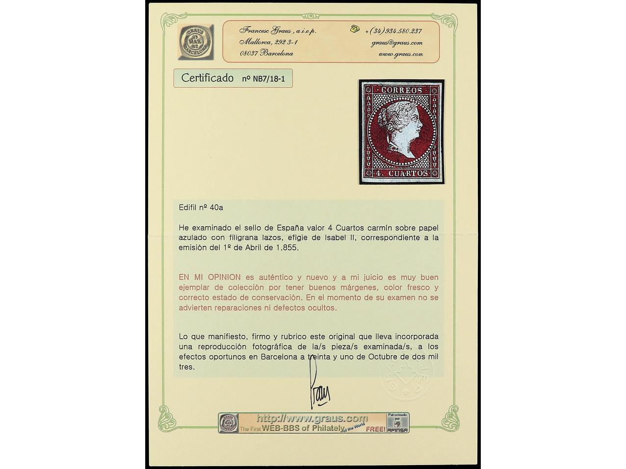 ESPAÑA. 4 cuartos rojo. Color muy intenso. PIEZA DE LUJO. Cert. GRAUS. Ed.40a. (Image1) (Image2)